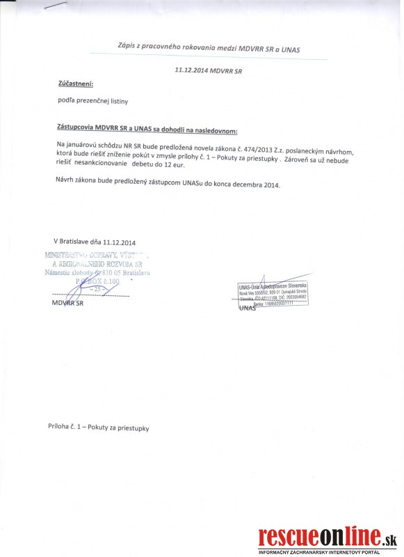 UNAS |MM| Únia autodopravcov Slovenska uzavrela dohodu s Ministerstvom dopravy a od 1.3.2015 dôjde k zníženia sadzieb mýtnych pokút na polovicu. "Toto zníženie pokút bude mať pozitívny vplyv na autodopravu, nakoľko sa mnohí autodopravcovia a hlavne vodiči nebudú musieť obávať vysokých pokút, ktoré by mohli ohroziť ich existenciu" dodal podpredseda UNASU Róbert Huran. K dohode došlo aj za účasti vrcholných zástupcov Národnej diaľničnej spoločnosti a Prezídia polície SR. "Splnením tejto požiadavky sa postupne napĺňajú niektoré z cieľov Únie a autodopravcov, na ktorých systematicky pracujeme už dlhú dobu" doplnil člen predsedníctva UNASU Stanislav Skala. Dopravco via apelujú aj s týmto príkladom, že nikde v Európe nemajú tak vysoké mýtne pokuty ako sú na Slovensku pri prečerpaní debetu. Pri zastavení mýtnou políciou vám udelia až 1500eur pokutu . Ako dobre všetci vieme, že tato pokuta je dnes likvidačná pre vodičov a niekedy narobí veľké problémy aj majiteľom spoločnosti. Nie je dobré keď sa pokuta dostane po nezaplatení a rozhodnutí krajským úradom do rúk exekútora, ktorí je dnes schopný vytvoriť obrovsky tlak zákonmi voči vodičovi ktorí ma priem. zárobku maximálne 800euro. A preto apeluje Unia autodopravcov o zníženie pokút a vyriešenie debetu ktorí je v každej európskej krajine samozrejmosťou. Dúfame, že po ďalších rokovaniach budú naplnene ďalšie požiadavky na ktoré stále apelujeme prehodnotenie zákazových značiek nad 12ton nakoľko sa zvyšujú dopravcom náklady ktoré sa musia premietnuť do cien tovarov a zbytočne vypúšťanie emisii do ovzdušia. Samosprávy ktorým patria cesty 2triedy a ministerstvo sa k tomu postavy pozitívne a prehodnotí naše požiadavky. Polícia či ministerstva ako aj samosprávy vytvárajú tlak na dopravcov aj vodičov aby bola bezpečnosť a plynulosť cestnej premávky prvoradá Unia autodopravcov sa tiež snaží pripomínať vodičom aby dodržiavali bezpečnosť a plynulosť cestnej premávky, ale koľko krát sa dostáva do sporu z vodičmi na negatívne odpovede, či sú aj cesty 1 a 2 aj3 triedy tak bezpečne pre kamió nov& amp;u acute; dopravu aká sa od nich vyžaduje.
