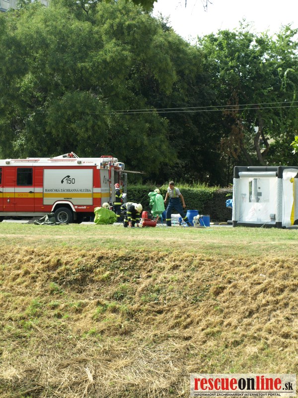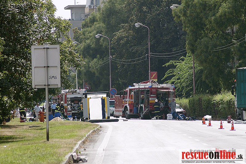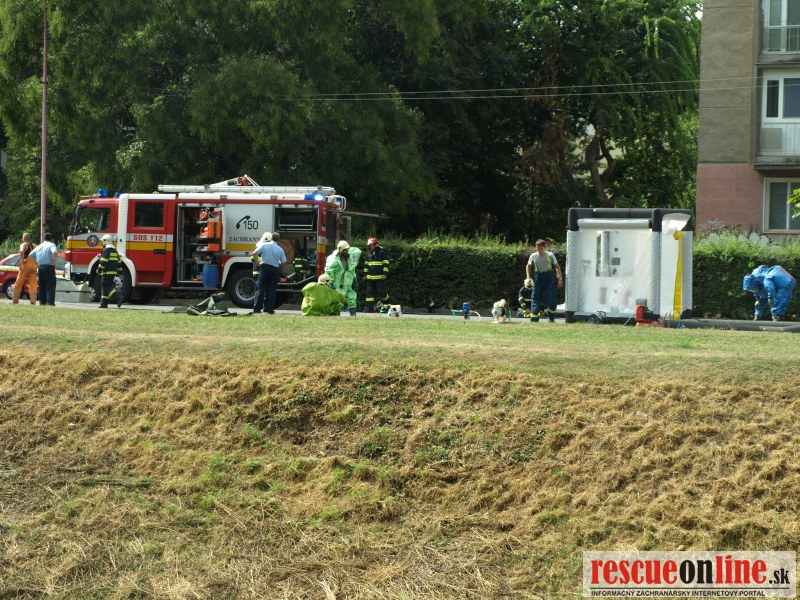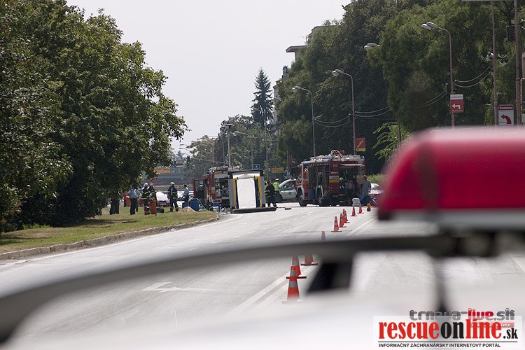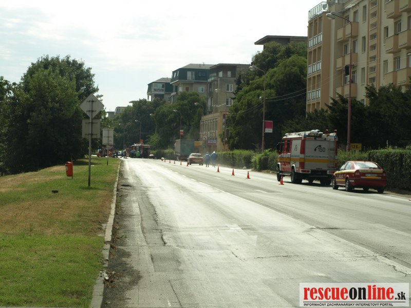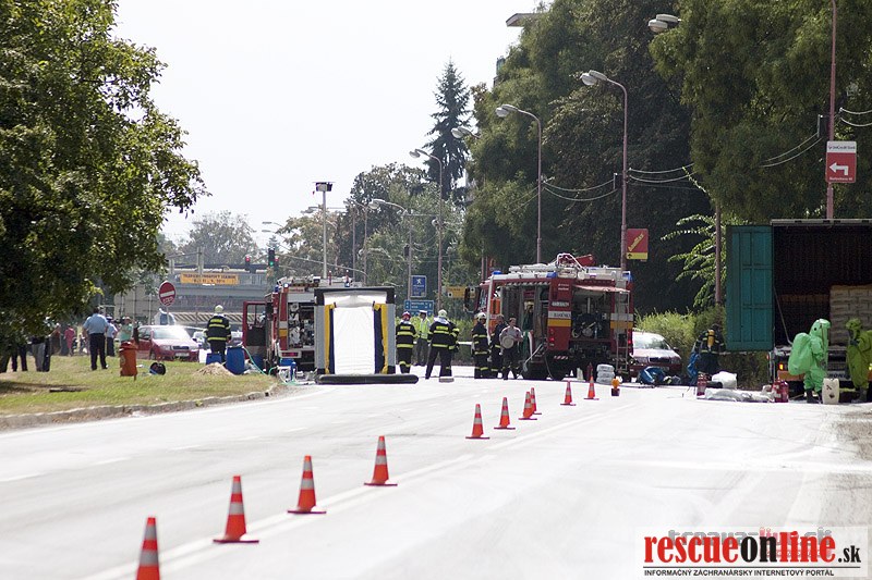 KR HaZZ Trnava |MM| Dnes o 10:39 hod. bol na IZS v Trnave oznámený únik kyseliny dusičnej z 50 litrového suda, ktorý sa nachádzal na voľnej ploche kamiónu. Kamión sa nachádzal na Hospodárskej ul. v Trnave. Zo suda uniklo cca 40 litrov kyseliny. Na mieste boli štyri hasičské zásahové vozidlá, zasahovalo 11 hasičov v protichemických oblekoch a na mieste udalosti bolo zriadené dekontaminačné pracovisko. Podľa dostupných informácii nikto z obyvateľov ani zo zasahujúcich hasičov postihnutý nebol.