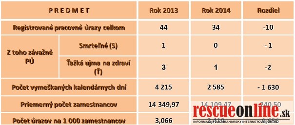 ŽSR |MM| V roku 2014 zaregistrovali Železnice Slovenskej republiky(ŽSR) 34 pracovných úrazov (PÚ), čo je o 10 menej ako v roku 2013, z toho bol jeden závažný pracovný úraz, a to ťažká ujma na zdraví (ŤUZ).