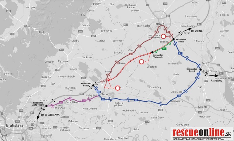 Obchádzkové trasy budú vedené v dotknutom úseku diaľnice D1 po ceste I/61, I/62, súbežných cestných komunikáciách v meste Trnava a po rýchlostnej ceste R1.