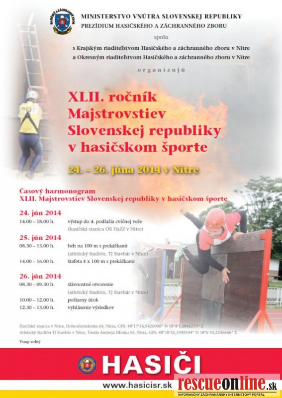 MVSR |MM| Prezídium Hasičského a záchranného zboru v spolupráci s Krajským riaditeľstvom Hasičského a záchranného a zboru a Okresným riaditeľstvom Hasičského a záchranného zboru v Nitre si Vás dovoľuje srdečne pozvať na XLII. ročník Majstrovstiev Slovenskej republiky v hasičskom športe, ktorý sa uskutoční už o týždeň - v dňoch od 24. – 26. júna 2014 v Nitre.