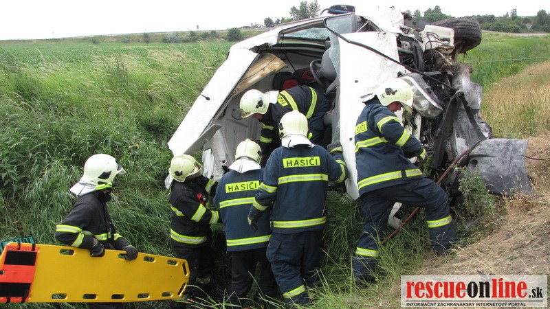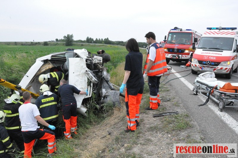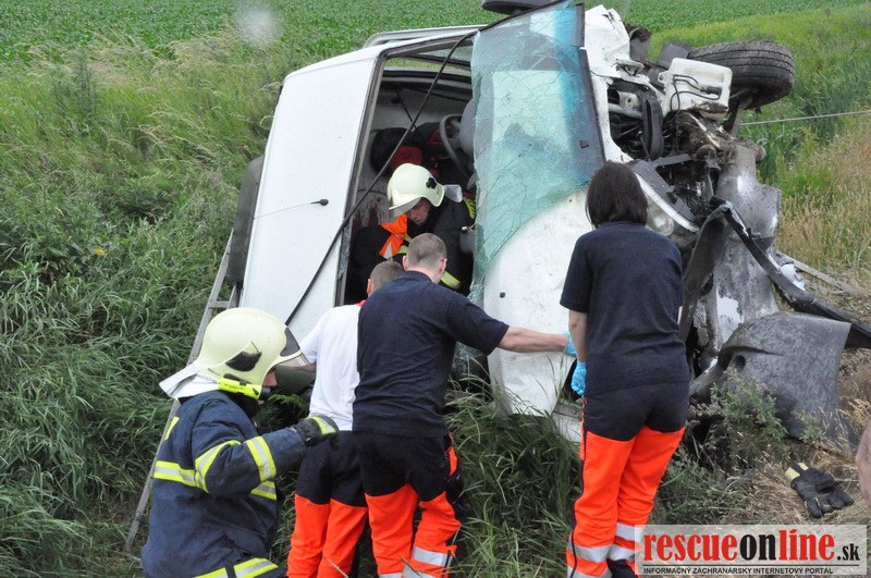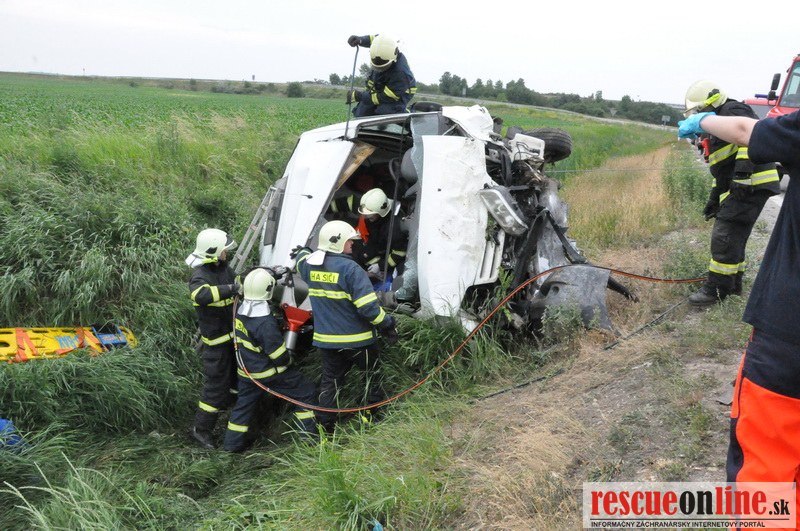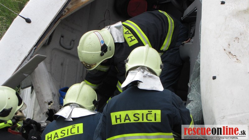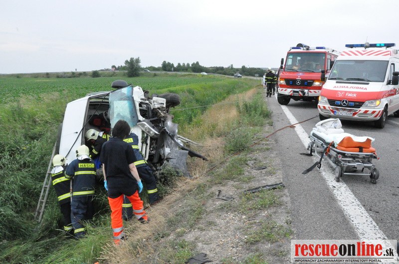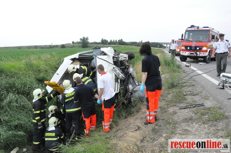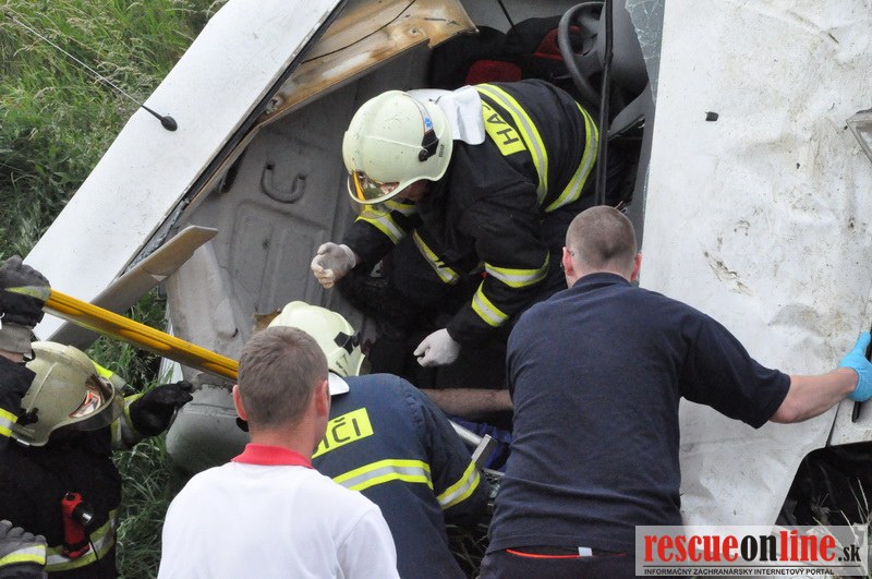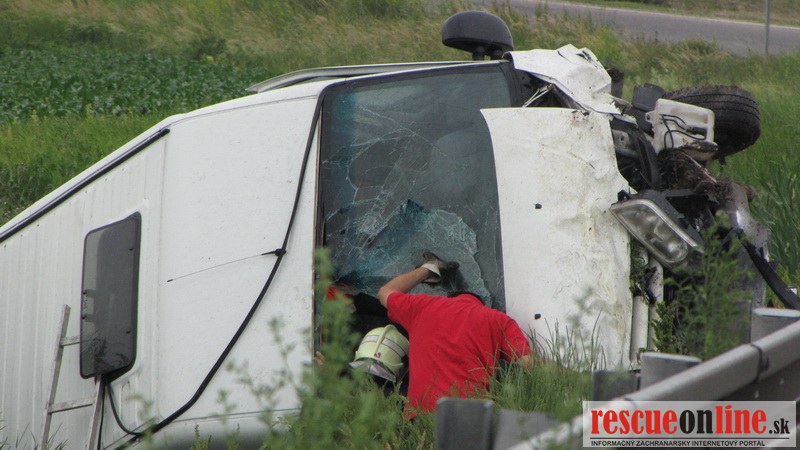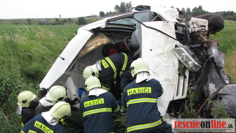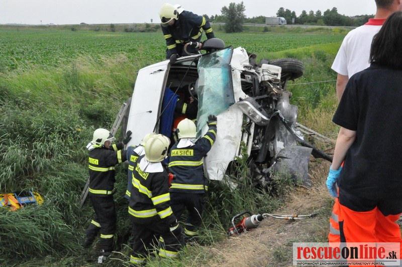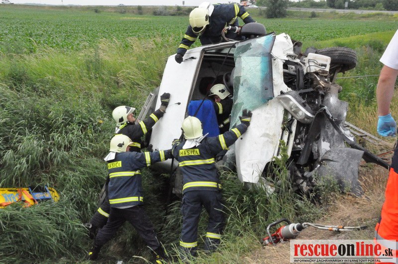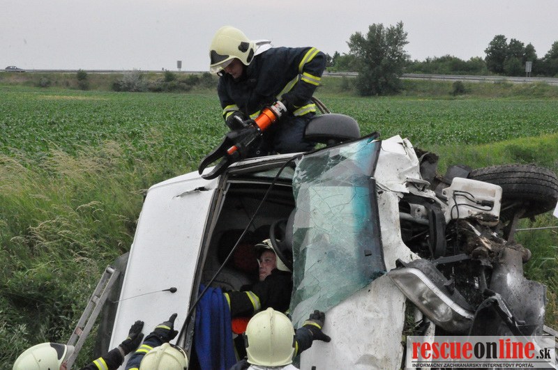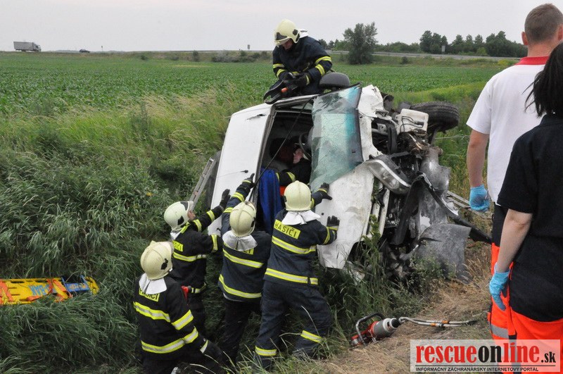 KR HaZZ Trnava |MM| Na operačné stredisko OR HaZZ v Galante bola prostredníctvom Koordinačného strediska IZS v Trnave vo štvrtok 2. júna 2011 o 16:09 hod. nahlásená dopravná nehoda dodávkového vozidla so zakliesnenou osobou na rýchlostnej komunikácii R1 v smere z Trnavy do Nitry za nadjazdom ponad R1 do Sládkovičova. Na miesto udalosti boli vyslaní štyria príslušníci HaZZ z hasičskej stanice Sereď s technikou AHZS MB Vario. Po príchode na miesto udalosti bolo prieskumom zistené, že dodávkové vozidlo je prevrátené na boku v priekope, k postihnutej osobe je veľmi zlý prístup a automobil je nestabilný. Z týchto dôvodov boli povolaní na miesto udalosti ďalší dvaja príslušníci z hasičskej stanice v Galante s technikou AHZS MB Sprinter. Príslušníci za pomoci rebríkov a navijaku vozidlo stabilizovali, zároveň odpojili akumulátor a vykonali protipožiarne opatrenia. Následne bol prostredníctvom vyslobodzovacieho zariadenia vytvorený priestor na vytiahnutie postihnutej osoby z vraku automobilu. Keďže nebolo možné vzhľadom k nevhodnej polohe tela vo vraku vozidla nasadiť chrbticový fixátor, z tohto dôvodu bola postihnutá osoba naložená na záchrannú dosku, premiestnená do sanitného vozidla zdravotnej služby a odovzdaná do starostlivosti lekárovi. Následne príslušníci HaZZ ukončili o 17:30 hod. svoju činnosť, odovzdali miesto udalosti diaľničnej polícii a vrátili sa na svoje základne.
