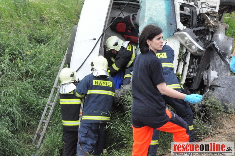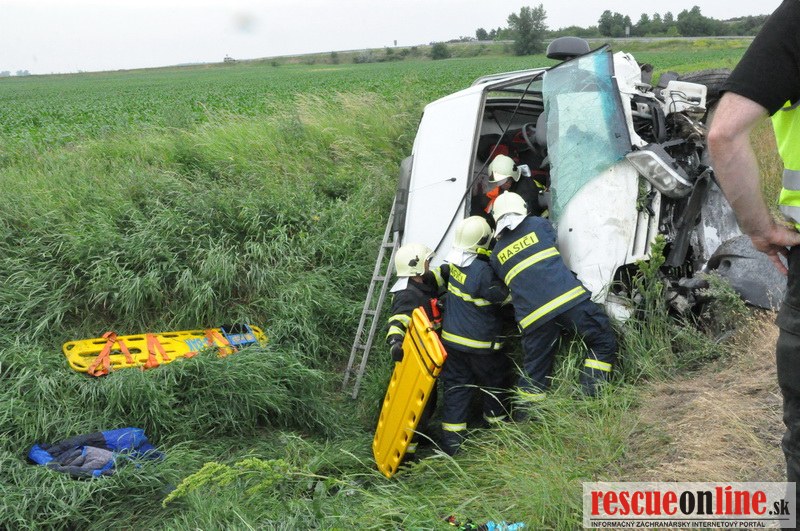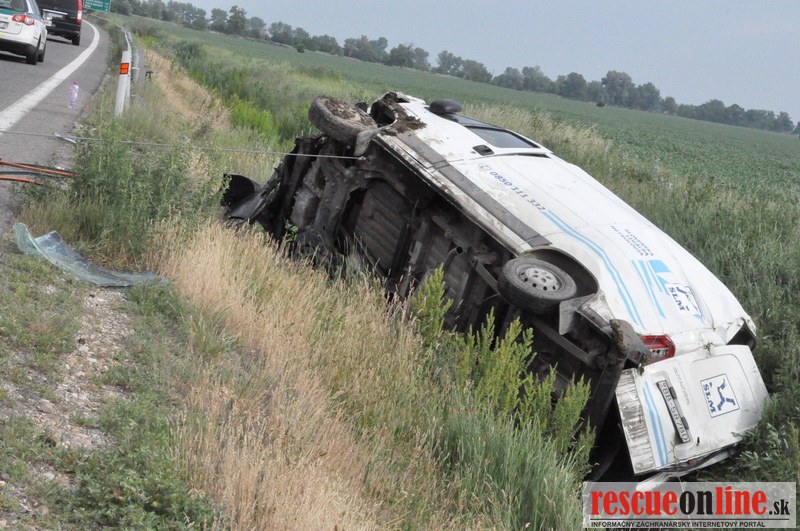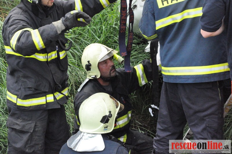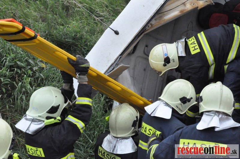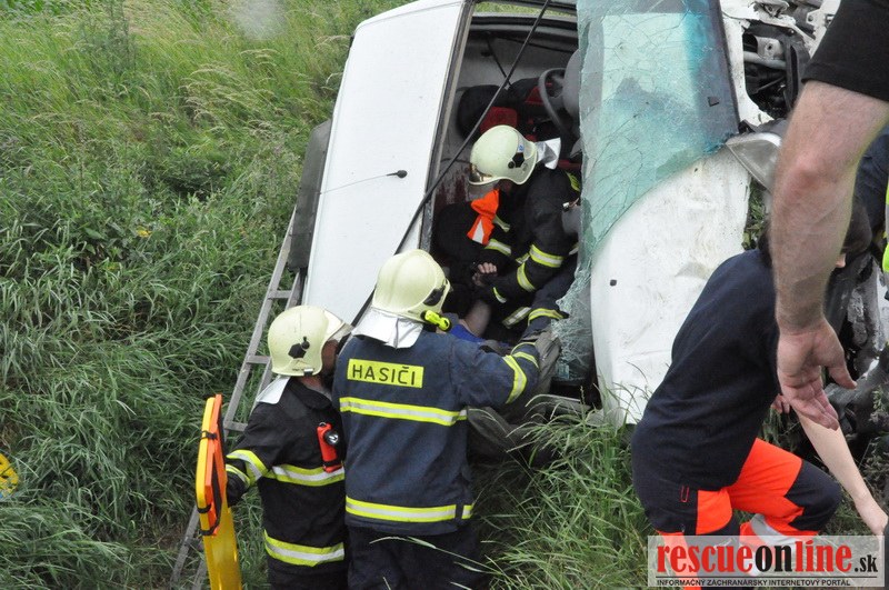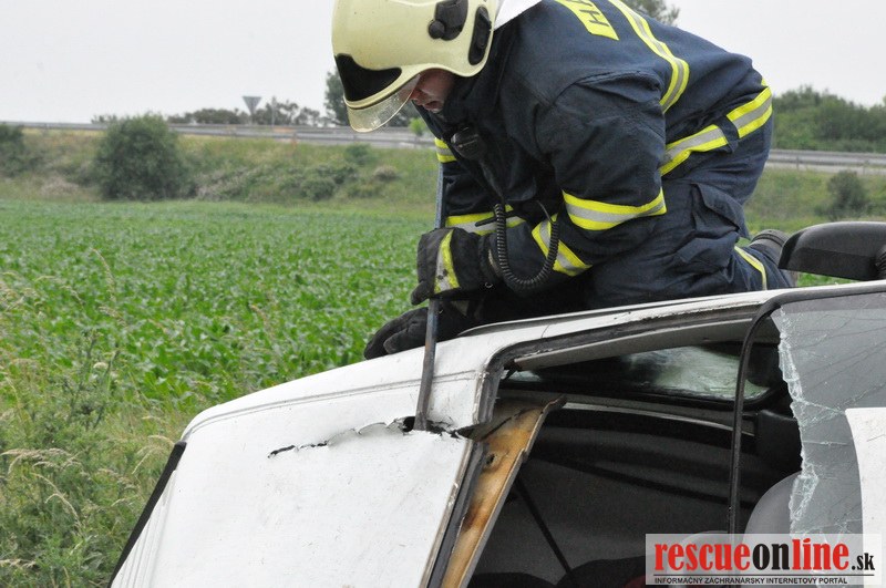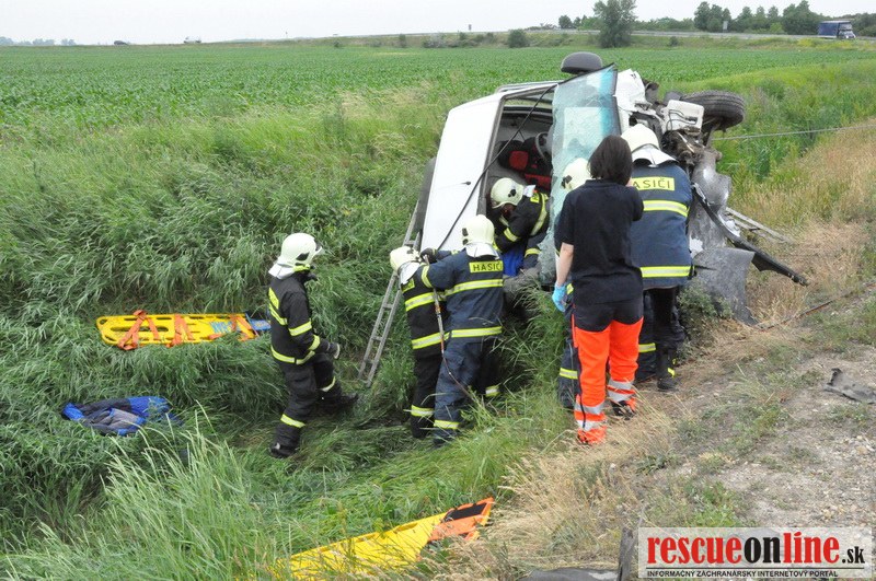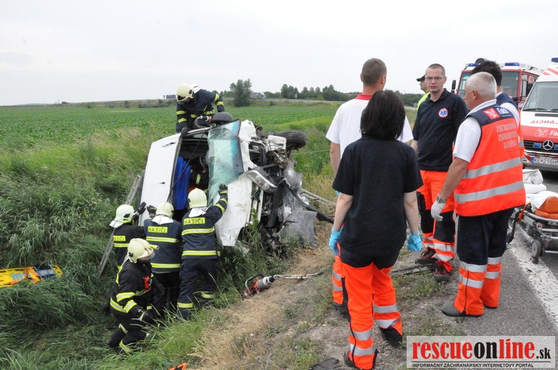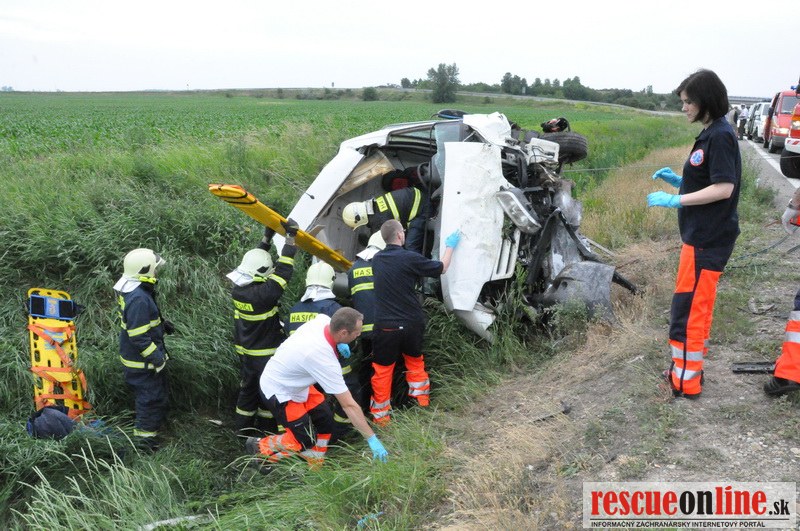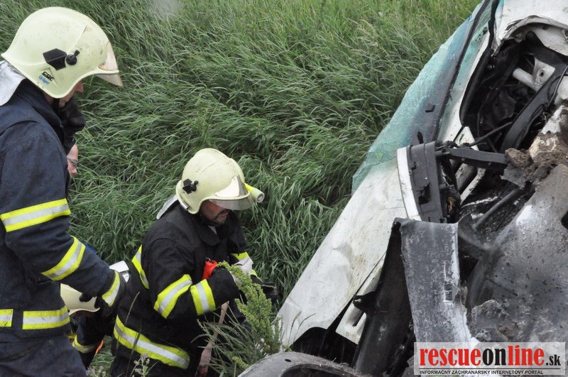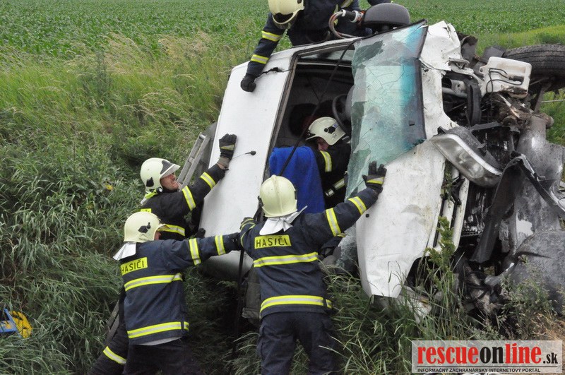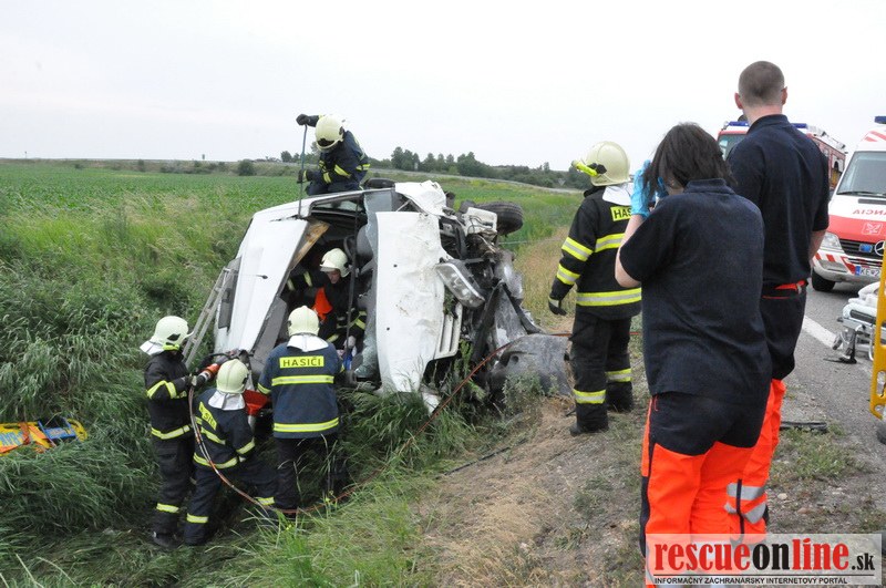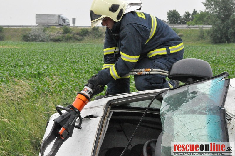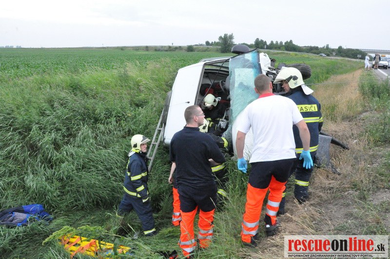 KR HaZZ Trnava |MM| Na operačné stredisko OR HaZZ v Galante bola prostredníctvom Koordinačného strediska IZS v Trnave vo štvrtok 2. júna 2011 o 16:09 hod. nahlásená dopravná nehoda dodávkového vozidla so zakliesnenou osobou na rýchlostnej komunikácii R1 v smere z Trnavy do Nitry za nadjazdom ponad R1 do Sládkovičova. Na miesto udalosti boli vyslaní štyria príslušníci HaZZ z hasičskej stanice Sereď s technikou AHZS MB Vario. Po príchode na miesto udalosti bolo prieskumom zistené, že dodávkové vozidlo je prevrátené na boku v priekope, k postihnutej osobe je veľmi zlý prístup a automobil je nestabilný. Z týchto dôvodov boli povolaní na miesto udalosti ďalší dvaja príslušníci z hasičskej stanice v Galante s technikou AHZS MB Sprinter. Príslušníci za pomoci rebríkov a navijaku vozidlo stabilizovali, zároveň odpojili akumulátor a vykonali protipožiarne opatrenia. Následne bol prostredníctvom vyslobodzovacieho zariadenia vytvorený priestor na vytiahnutie postihnutej osoby z vraku automobilu. Keďže nebolo možné vzhľadom k nevhodnej polohe tela vo vraku vozidla nasadiť chrbticový fixátor, z tohto dôvodu bola postihnutá osoba naložená na záchrannú dosku, premiestnená do sanitného vozidla zdravotnej služby a odovzdaná do starostlivosti lekárovi. Následne príslušníci HaZZ ukončili o 17:30 hod. svoju činnosť, odovzdali miesto udalosti diaľničnej polícii a vrátili sa na svoje základne.