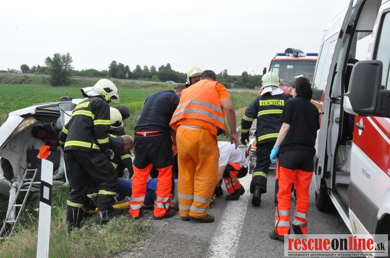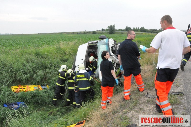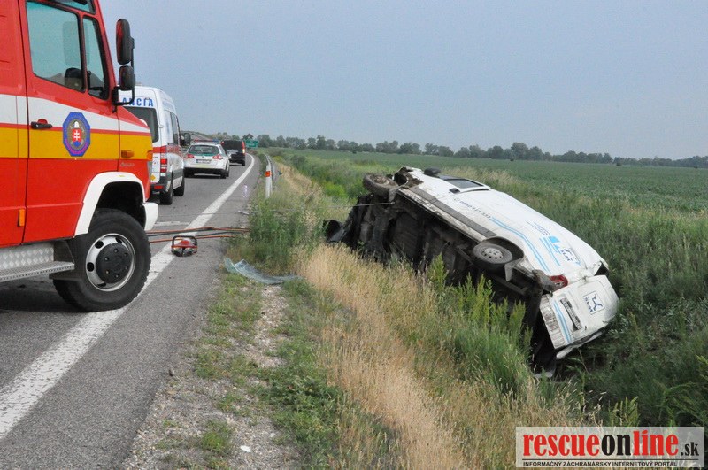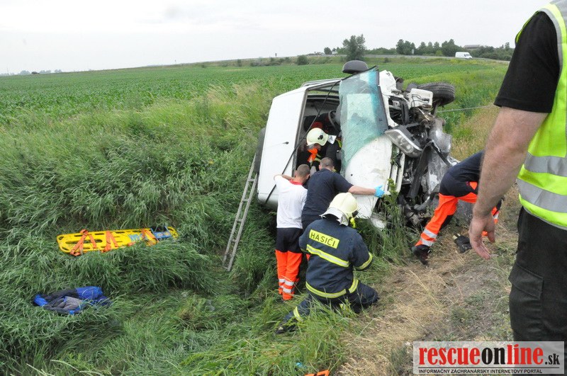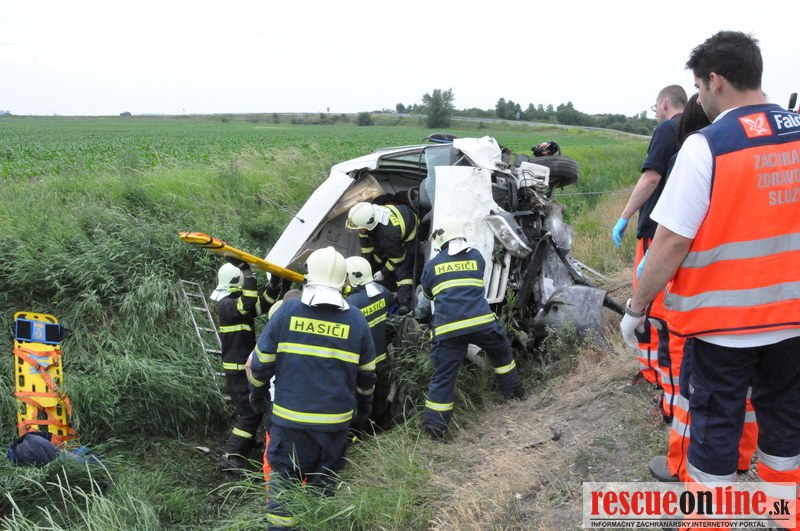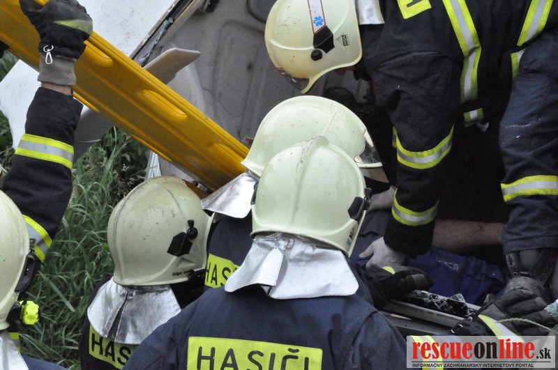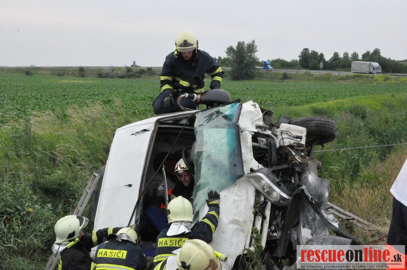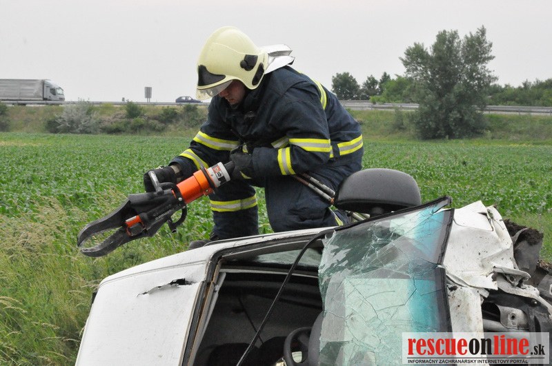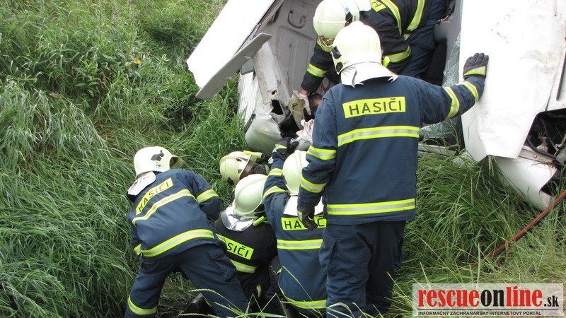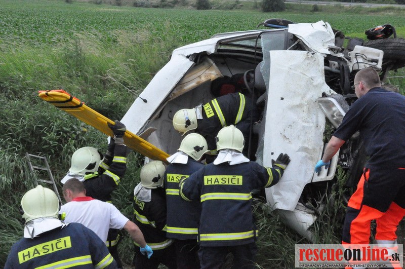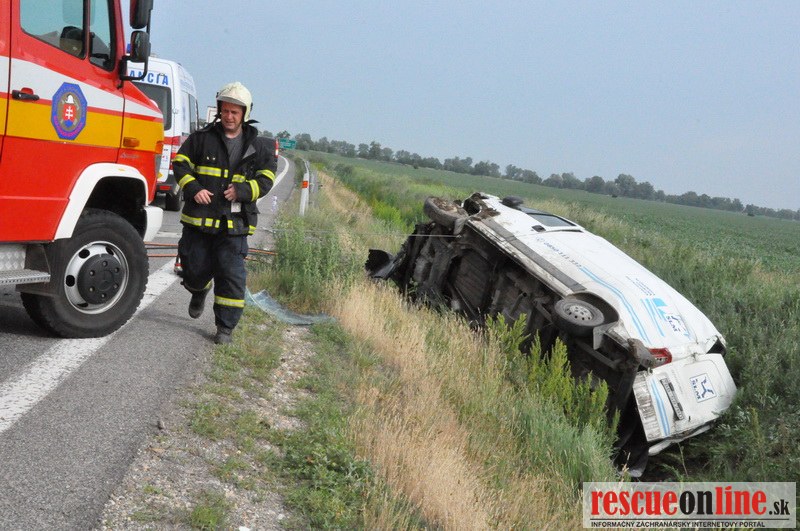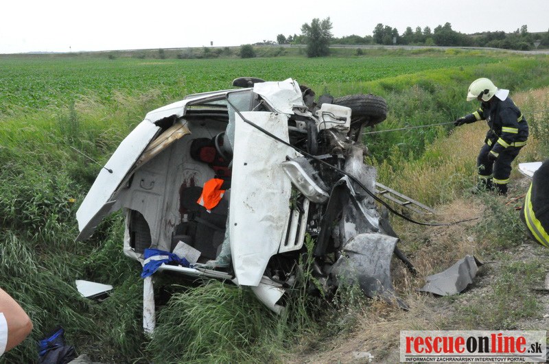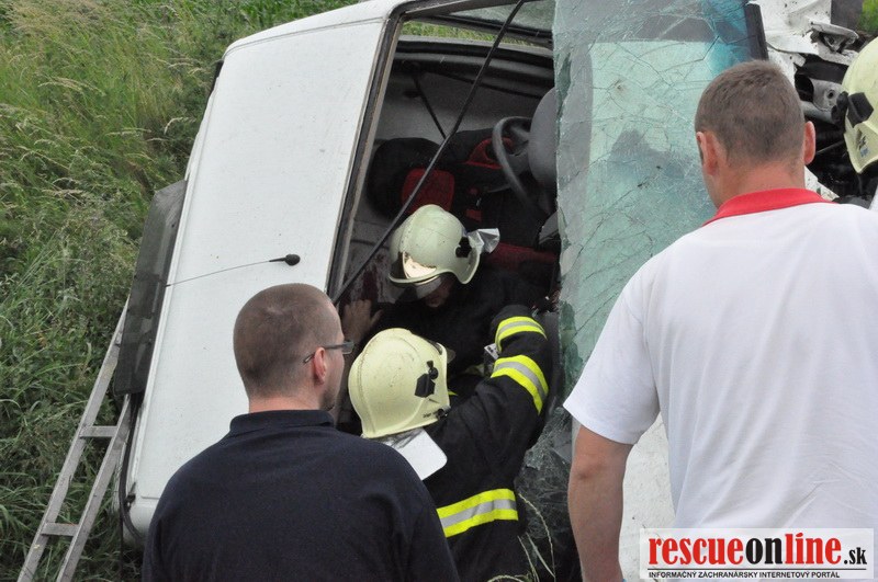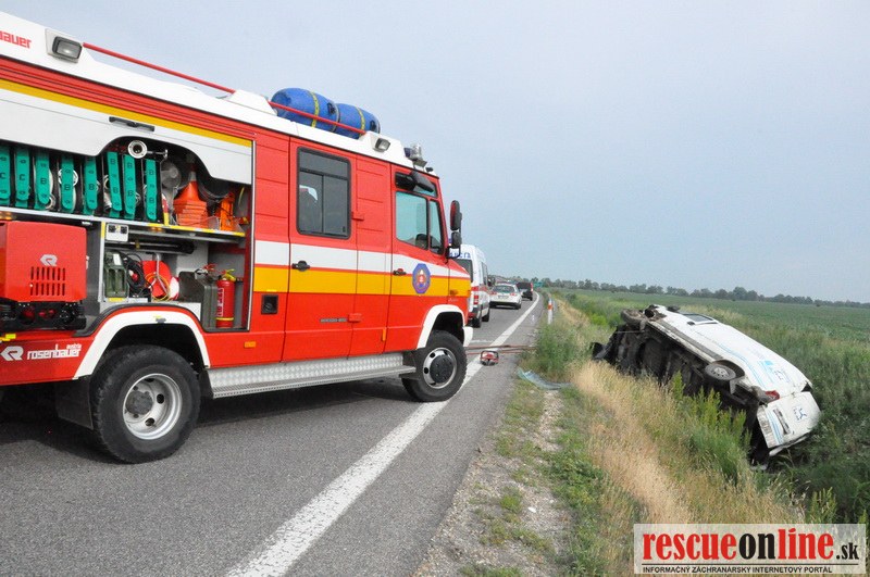 KR HaZZ Trnava |MM| Na operačné stredisko OR HaZZ v Galante bola prostredníctvom Koordinačného strediska IZS v Trnave vo štvrtok 2. júna 2011 o 16:09 hod. nahlásená dopravná nehoda dodávkového vozidla so zakliesnenou osobou na rýchlostnej komunikácii R1 v smere z Trnavy do Nitry za nadjazdom ponad R1 do Sládkovičova. Na miesto udalosti boli vyslaní štyria príslušníci HaZZ z hasičskej stanice Sereď s technikou AHZS MB Vario. Po príchode na miesto udalosti bolo prieskumom zistené, že dodávkové vozidlo je prevrátené na boku v priekope, k postihnutej osobe je veľmi zlý prístup a automobil je nestabilný. Z týchto dôvodov boli povolaní na miesto udalosti ďalší dvaja príslušníci z hasičskej stanice v Galante s technikou AHZS MB Sprinter. Príslušníci za pomoci rebríkov a navijaku vozidlo stabilizovali, zároveň odpojili akumulátor a vykonali protipožiarne opatrenia. Následne bol prostredníctvom vyslobodzovacieho zariadenia vytvorený priestor na vytiahnutie postihnutej osoby z vraku automobilu. Keďže nebolo možné vzhľadom k nevhodnej polohe tela vo vraku vozidla nasadiť chrbticový fixátor, z tohto dôvodu bola postihnutá osoba naložená na záchrannú dosku, premiestnená do sanitného vozidla zdravotnej služby a odovzdaná do starostlivosti lekárovi. Následne príslušníci HaZZ ukončili o 17:30 hod. svoju činnosť, odovzdali miesto udalosti diaľničnej polícii a vrátili sa na svoje základne.