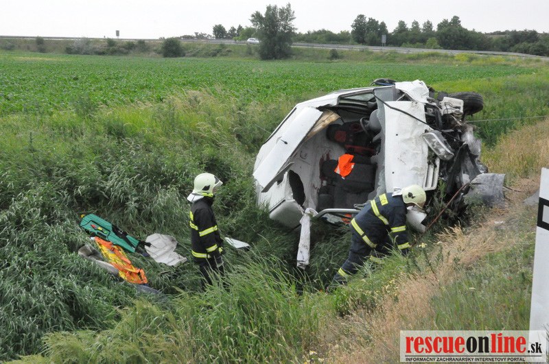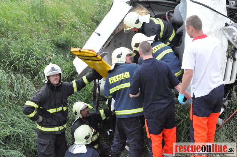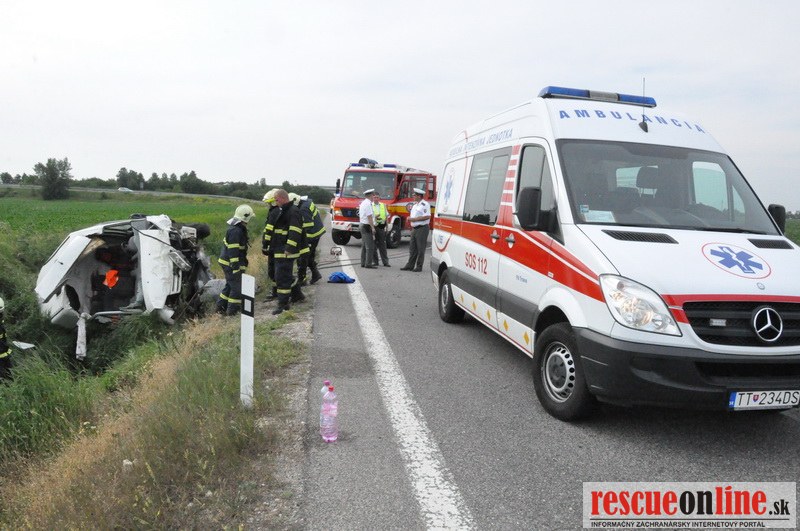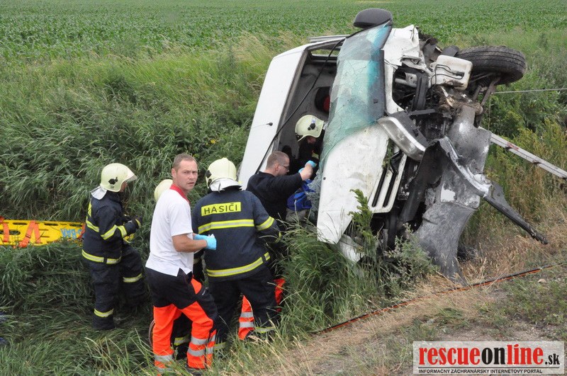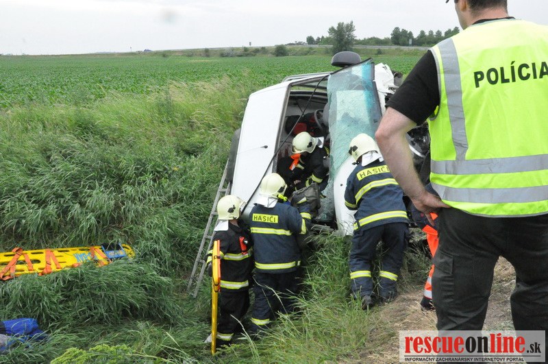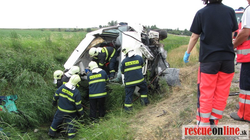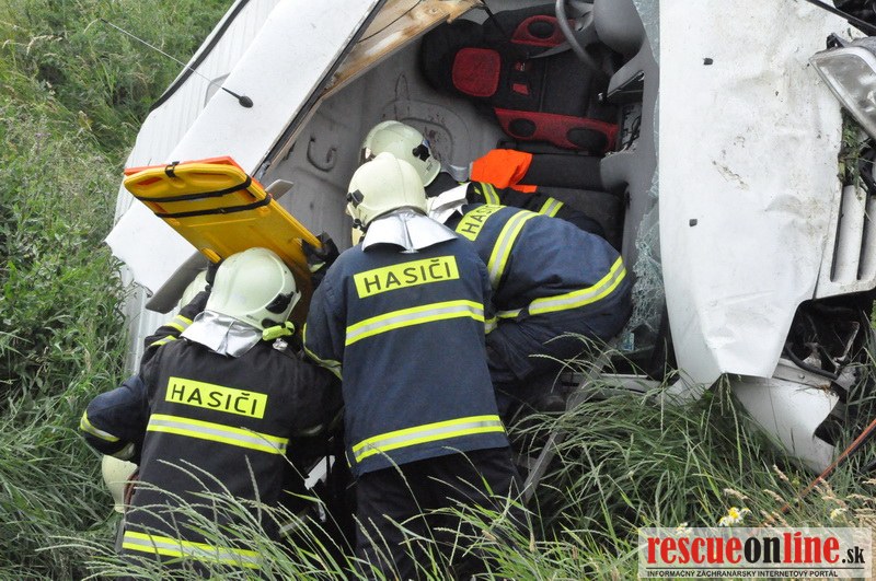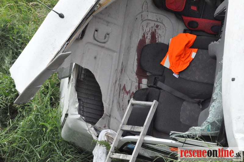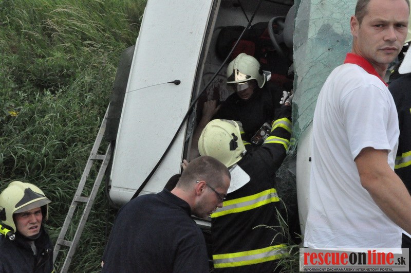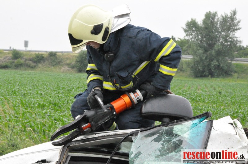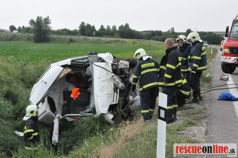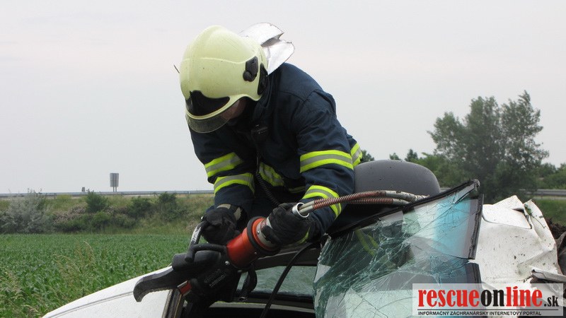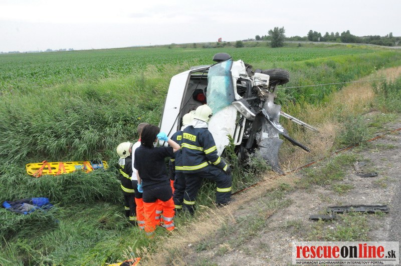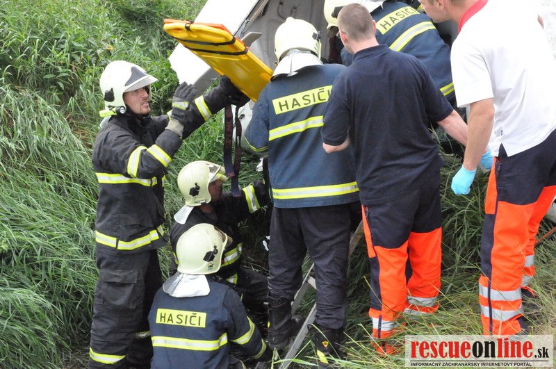 KR HaZZ Trnava |MM| Na operačné stredisko OR HaZZ v Galante bola prostredníctvom Koordinačného strediska IZS v Trnave vo štvrtok 2. júna 2011 o 16:09 hod. nahlásená dopravná nehoda dodávkového vozidla so zakliesnenou osobou na rýchlostnej komunikácii R1 v smere z Trnavy do Nitry za nadjazdom ponad R1 do Sládkovičova. Na miesto udalosti boli vyslaní štyria príslušníci HaZZ z hasičskej stanice Sereď s technikou AHZS MB Vario. Po príchode na miesto udalosti bolo prieskumom zistené, že dodávkové vozidlo je prevrátené na boku v priekope, k postihnutej osobe je veľmi zlý prístup a automobil je nestabilný. Z týchto dôvodov boli povolaní na miesto udalosti ďalší dvaja príslušníci z hasičskej stanice v Galante s technikou AHZS MB Sprinter. Príslušníci za pomoci rebríkov a navijaku vozidlo stabilizovali, zároveň odpojili akumulátor a vykonali protipožiarne opatrenia. Následne bol prostredníctvom vyslobodzovacieho zariadenia vytvorený priestor na vytiahnutie postihnutej osoby z vraku automobilu. Keďže nebolo možné vzhľadom k nevhodnej polohe tela vo vraku vozidla nasadiť chrbticový fixátor, z tohto dôvodu bola postihnutá osoba naložená na záchrannú dosku, premiestnená do sanitného vozidla zdravotnej služby a odovzdaná do starostlivosti lekárovi. Následne príslušníci HaZZ ukončili o 17:30 hod. svoju činnosť, odovzdali miesto udalosti diaľničnej polícii a vrátili sa na svoje základne.