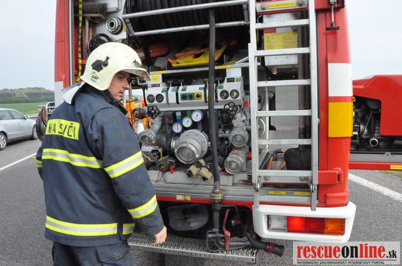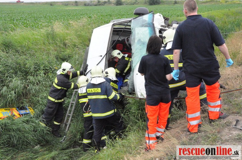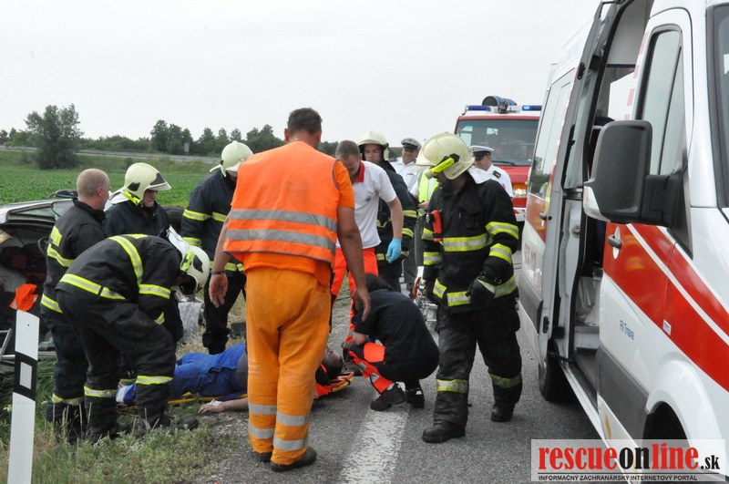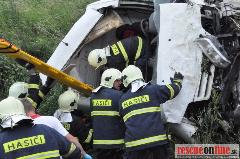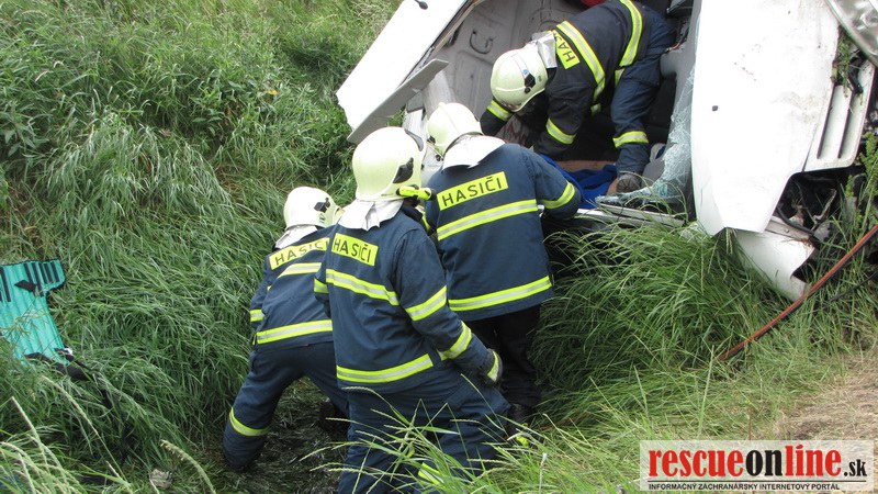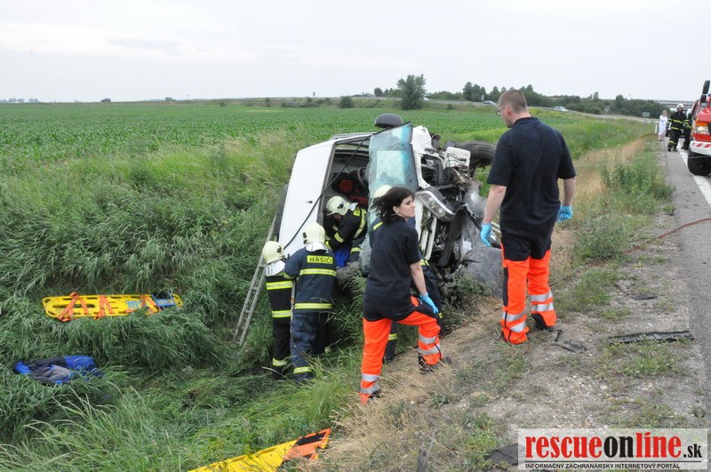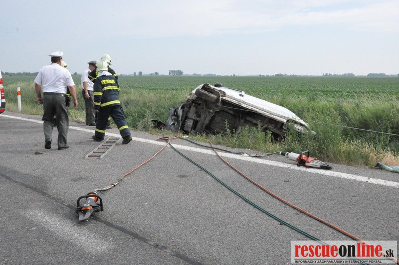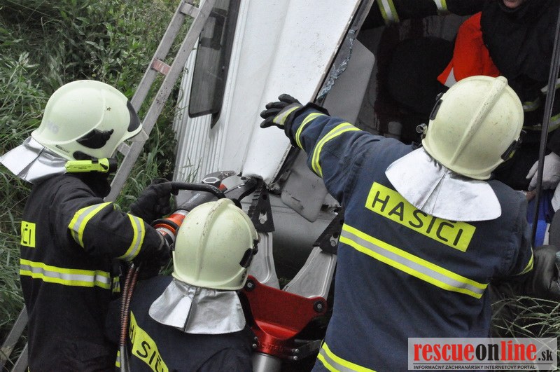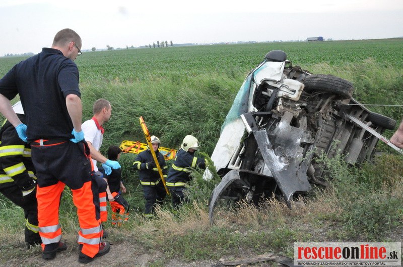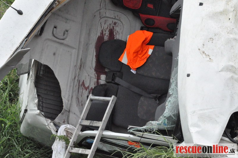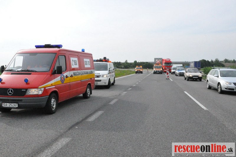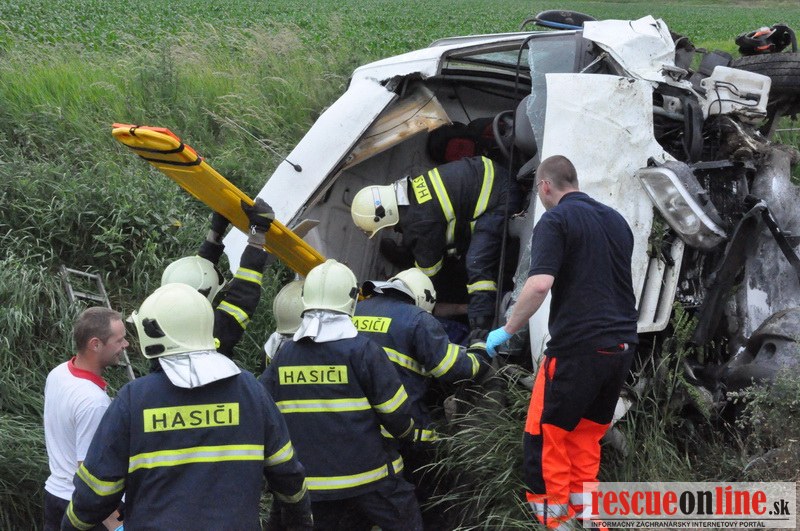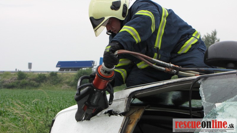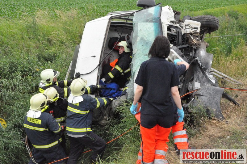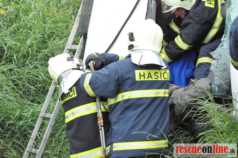 KR HaZZ Trnava |MM| Na operačné stredisko OR HaZZ v Galante bola prostredníctvom Koordinačného strediska IZS v Trnave vo štvrtok 2. júna 2011 o 16:09 hod. nahlásená dopravná nehoda dodávkového vozidla so zakliesnenou osobou na rýchlostnej komunikácii R1 v smere z Trnavy do Nitry za nadjazdom ponad R1 do Sládkovičova. Na miesto udalosti boli vyslaní štyria príslušníci HaZZ z hasičskej stanice Sereď s technikou AHZS MB Vario. Po príchode na miesto udalosti bolo prieskumom zistené, že dodávkové vozidlo je prevrátené na boku v priekope, k postihnutej osobe je veľmi zlý prístup a automobil je nestabilný. Z týchto dôvodov boli povolaní na miesto udalosti ďalší dvaja príslušníci z hasičskej stanice v Galante s technikou AHZS MB Sprinter. Príslušníci za pomoci rebríkov a navijaku vozidlo stabilizovali, zároveň odpojili akumulátor a vykonali protipožiarne opatrenia. Následne bol prostredníctvom vyslobodzovacieho zariadenia vytvorený priestor na vytiahnutie postihnutej osoby z vraku automobilu. Keďže nebolo možné vzhľadom k nevhodnej polohe tela vo vraku vozidla nasadiť chrbticový fixátor, z tohto dôvodu bola postihnutá osoba naložená na záchrannú dosku, premiestnená do sanitného vozidla zdravotnej služby a odovzdaná do starostlivosti lekárovi. Následne príslušníci HaZZ ukončili o 17:30 hod. svoju činnosť, odovzdali miesto udalosti diaľničnej polícii a vrátili sa na svoje základne.