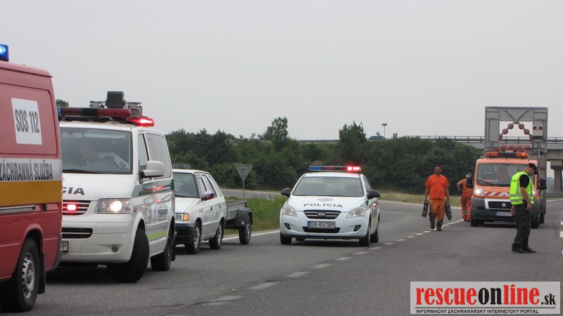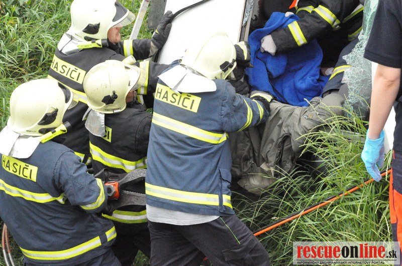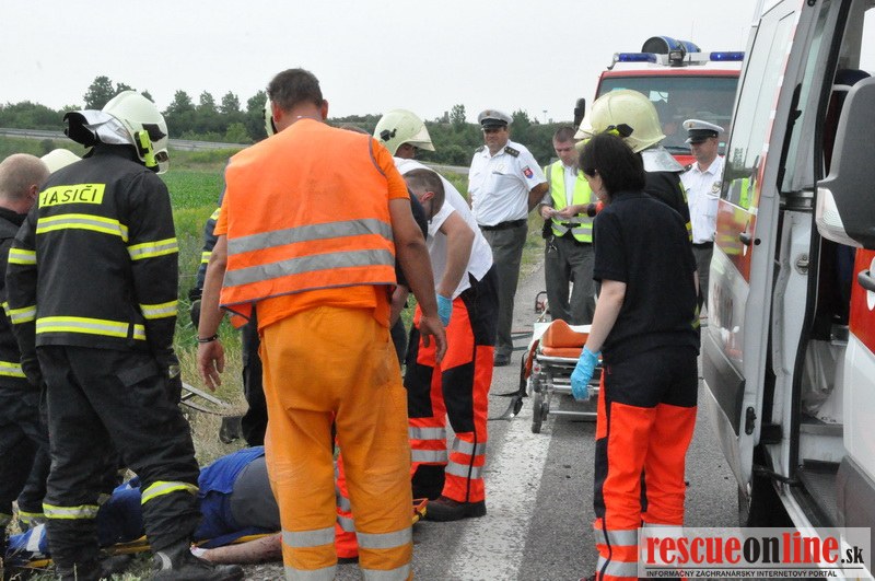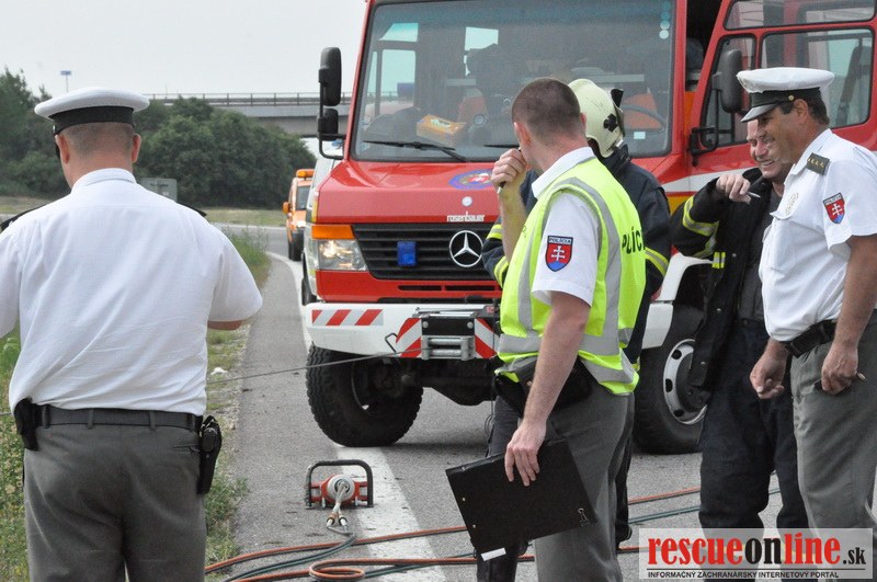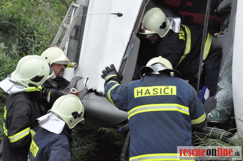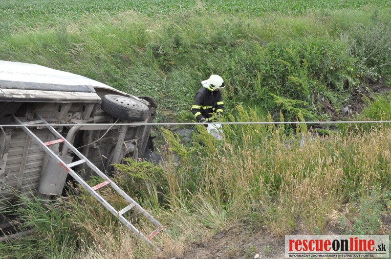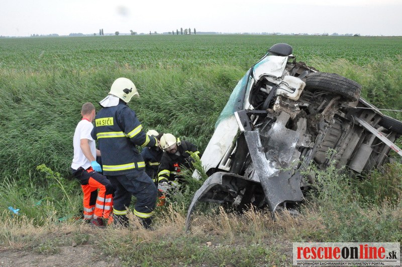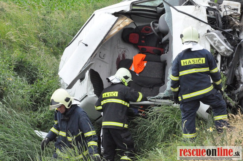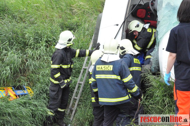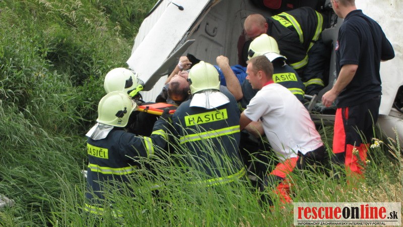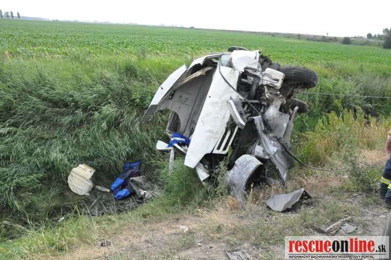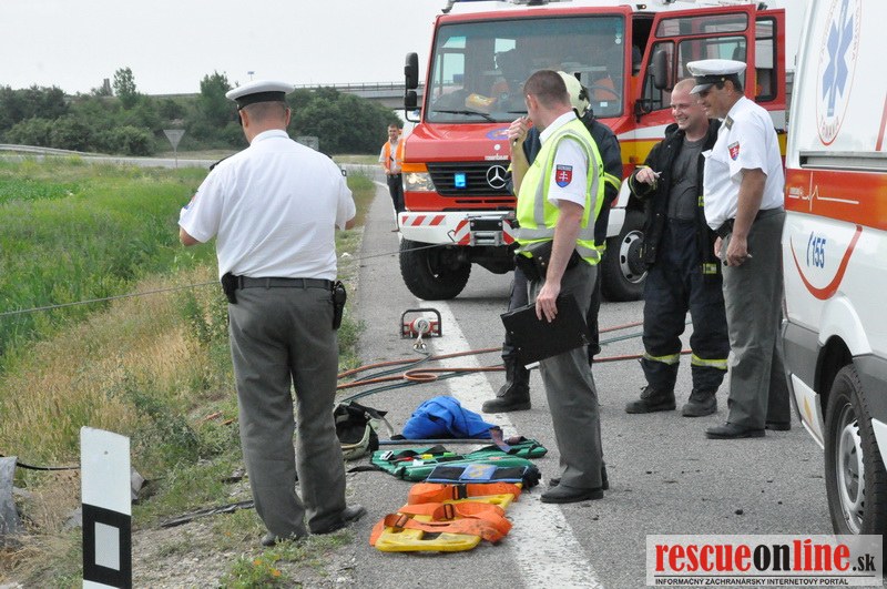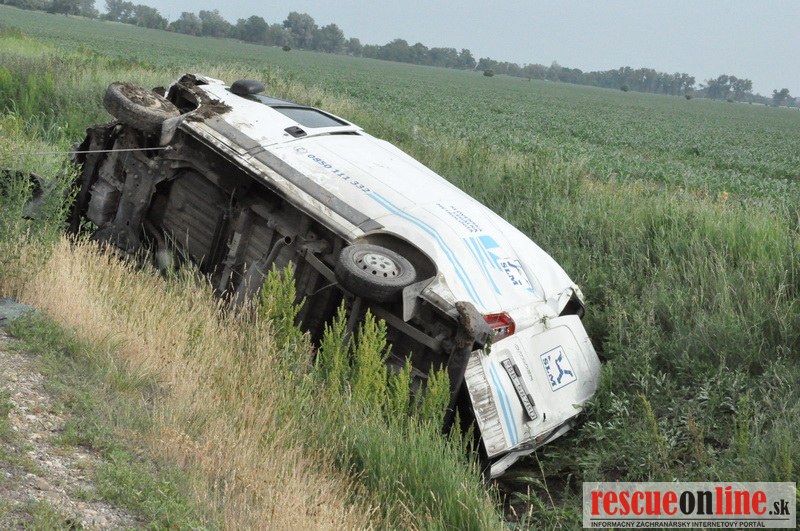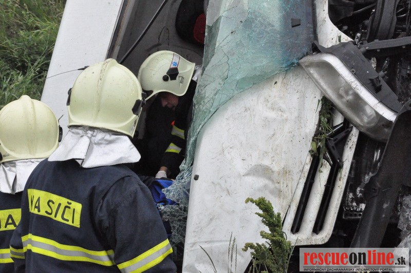 KR HaZZ Trnava |MM| Na operačné stredisko OR HaZZ v Galante bola prostredníctvom Koordinačného strediska IZS v Trnave vo štvrtok 2. júna 2011 o 16:09 hod. nahlásená dopravná nehoda dodávkového vozidla so zakliesnenou osobou na rýchlostnej komunikácii R1 v smere z Trnavy do Nitry za nadjazdom ponad R1 do Sládkovičova. Na miesto udalosti boli vyslaní štyria príslušníci HaZZ z hasičskej stanice Sereď s technikou AHZS MB Vario. Po príchode na miesto udalosti bolo prieskumom zistené, že dodávkové vozidlo je prevrátené na boku v priekope, k postihnutej osobe je veľmi zlý prístup a automobil je nestabilný. Z týchto dôvodov boli povolaní na miesto udalosti ďalší dvaja príslušníci z hasičskej stanice v Galante s technikou AHZS MB Sprinter. Príslušníci za pomoci rebríkov a navijaku vozidlo stabilizovali, zároveň odpojili akumulátor a vykonali protipožiarne opatrenia. Následne bol prostredníctvom vyslobodzovacieho zariadenia vytvorený priestor na vytiahnutie postihnutej osoby z vraku automobilu. Keďže nebolo možné vzhľadom k nevhodnej polohe tela vo vraku vozidla nasadiť chrbticový fixátor, z tohto dôvodu bola postihnutá osoba naložená na záchrannú dosku, premiestnená do sanitného vozidla zdravotnej služby a odovzdaná do starostlivosti lekárovi. Následne príslušníci HaZZ ukončili o 17:30 hod. svoju činnosť, odovzdali miesto udalosti diaľničnej polícii a vrátili sa na svoje základne.