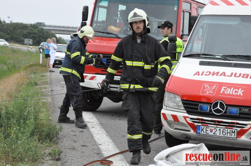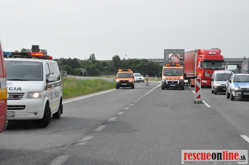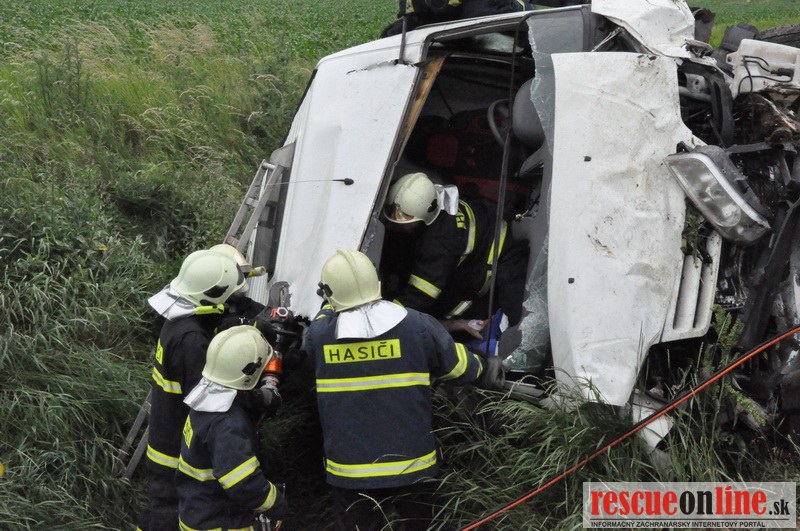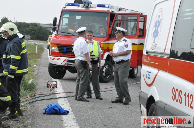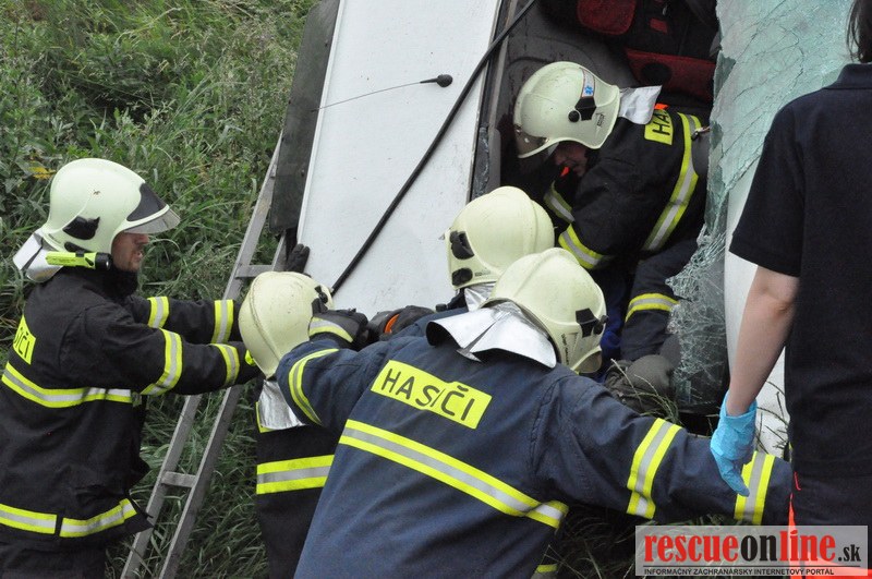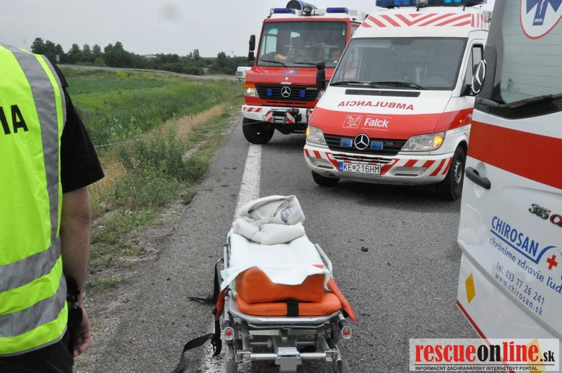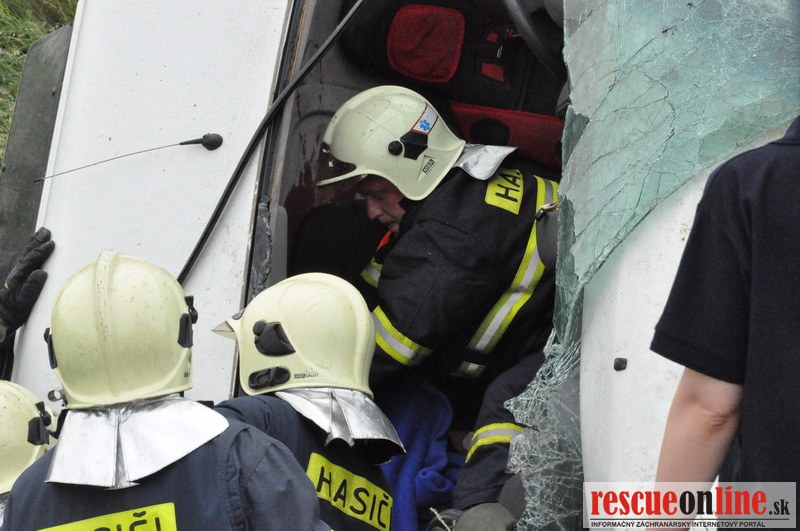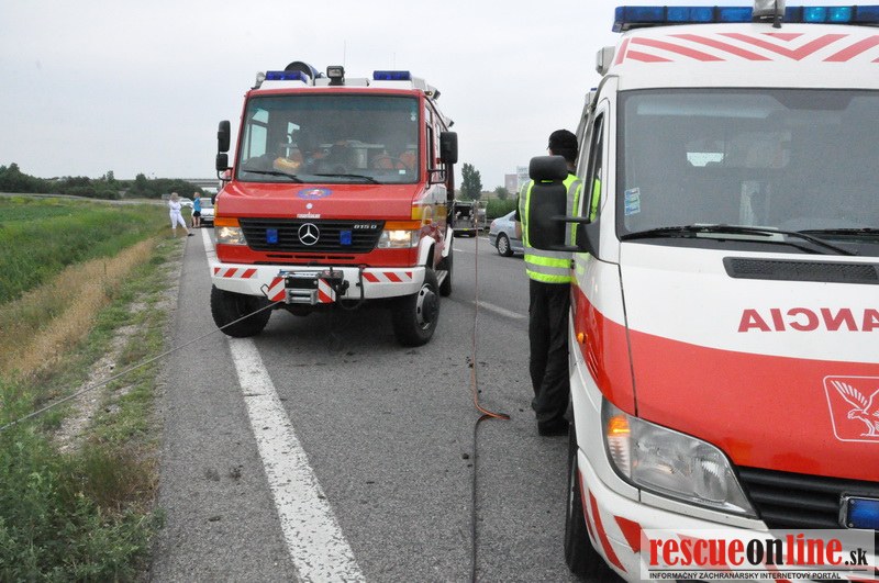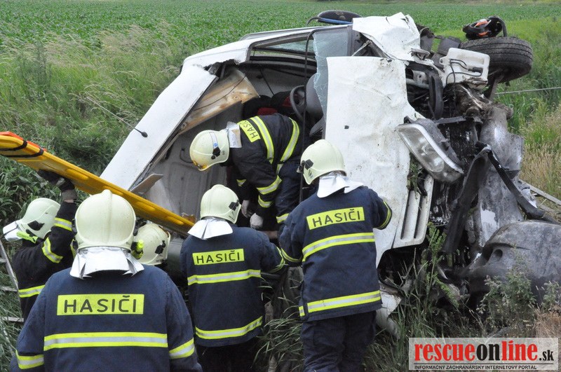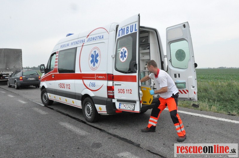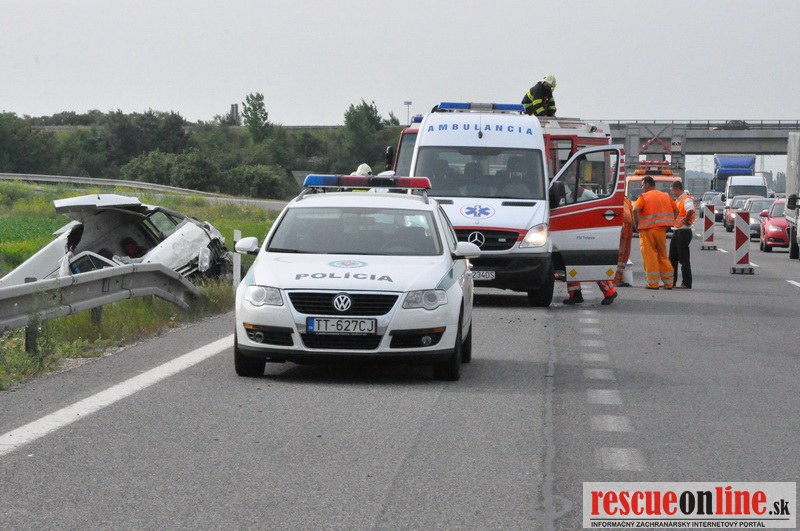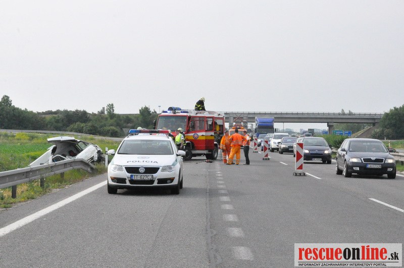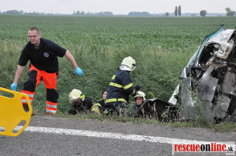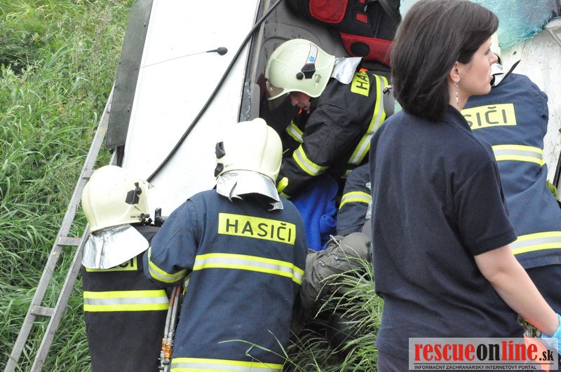 KR HaZZ Trnava |MM| Na operačné stredisko OR HaZZ v Galante bola prostredníctvom Koordinačného strediska IZS v Trnave vo štvrtok 2. júna 2011 o 16:09 hod. nahlásená dopravná nehoda dodávkového vozidla so zakliesnenou osobou na rýchlostnej komunikácii R1 v smere z Trnavy do Nitry za nadjazdom ponad R1 do Sládkovičova. Na miesto udalosti boli vyslaní štyria príslušníci HaZZ z hasičskej stanice Sereď s technikou AHZS MB Vario. Po príchode na miesto udalosti bolo prieskumom zistené, že dodávkové vozidlo je prevrátené na boku v priekope, k postihnutej osobe je veľmi zlý prístup a automobil je nestabilný. Z týchto dôvodov boli povolaní na miesto udalosti ďalší dvaja príslušníci z hasičskej stanice v Galante s technikou AHZS MB Sprinter. Príslušníci za pomoci rebríkov a navijaku vozidlo stabilizovali, zároveň odpojili akumulátor a vykonali protipožiarne opatrenia. Následne bol prostredníctvom vyslobodzovacieho zariadenia vytvorený priestor na vytiahnutie postihnutej osoby z vraku automobilu. Keďže nebolo možné vzhľadom k nevhodnej polohe tela vo vraku vozidla nasadiť chrbticový fixátor, z tohto dôvodu bola postihnutá osoba naložená na záchrannú dosku, premiestnená do sanitného vozidla zdravotnej služby a odovzdaná do starostlivosti lekárovi. Následne príslušníci HaZZ ukončili o 17:30 hod. svoju činnosť, odovzdali miesto udalosti diaľničnej polícii a vrátili sa na svoje základne.