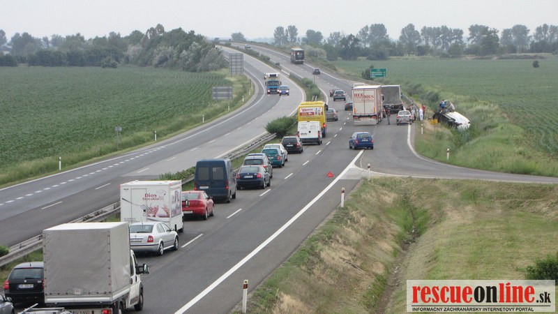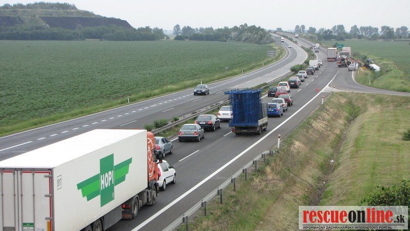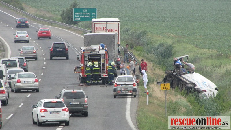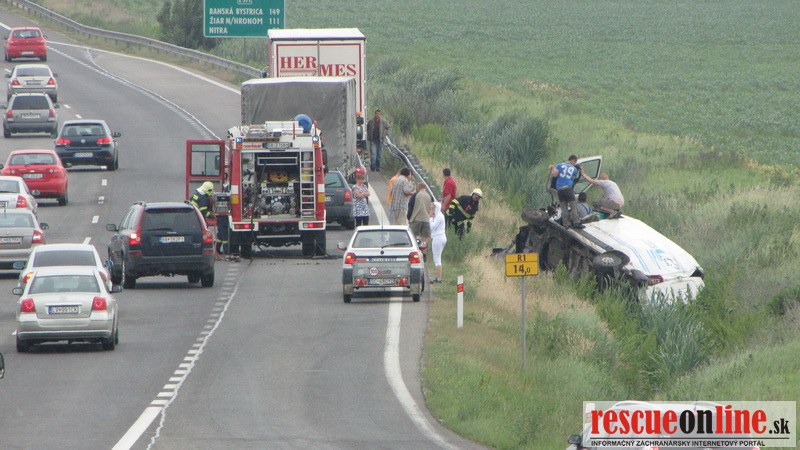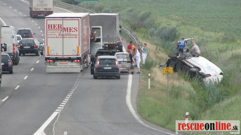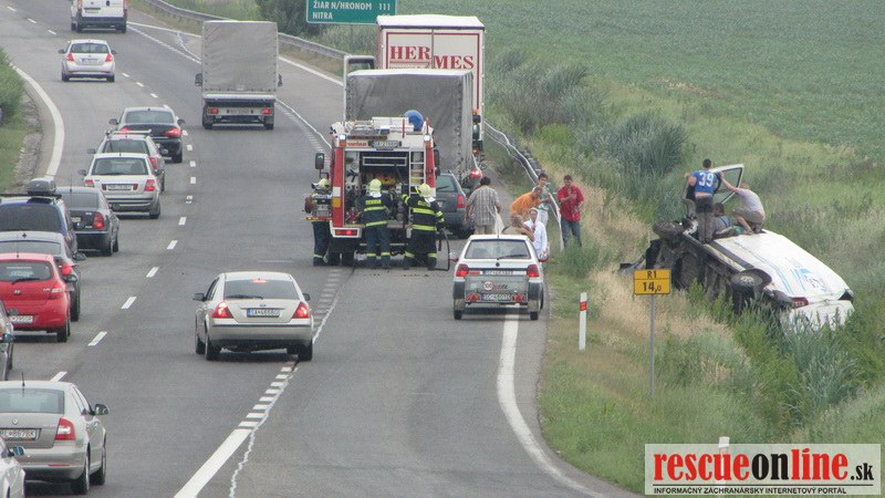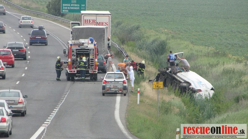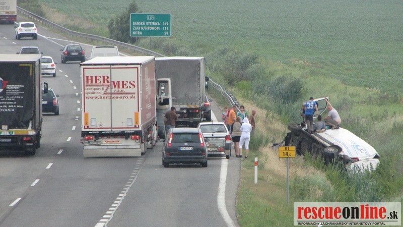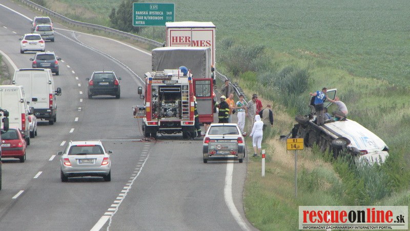 Sereď | R1 | Vo štvrtok v popoludňajších hodinách sa na rýchlostnej komunikácii R1 v smre z Bratislavy do Nitry za nadjazdom ponad R1 do Sládkovičova, stala dopravná nehoda. Dodávka zišla z cesty a skončila v priekope. Na mieste dopravnej nehody zasahovali hasiči HaZZ zo Serede, ktorí si na pomoc vzhľadom k náročnosti zásahu privolali jednotku z Galanty. Vodič dodávky po jej prevrátení zostal zakliesnený vo vozidle. Hasiči boli nútení havarované vozidlo rozstihať, nakoľko iný k zdravotnému stavu zranenej osoby vhodný spôsob jej vyprostenia z vozidla nejestvoval. Vyprosťovanie osoby z vozidla trvalo asi pol hodinu. Na mieste dopravnej nehody zasahovali dve osádky RZP, hliadka OO PZ zo Serede, nehodovka o policajti dialničného oddelenia PZ Trnava - Modranka. Doprava v danom úseku rýchlostnej komunikácie bola obmedzená do jedného jazdného pruhu.