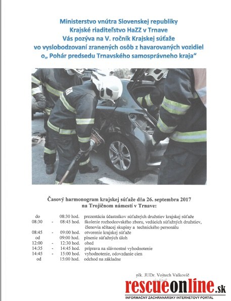 KR HaZZ Trnava |MM| MVSR a KR HaZZ v Trnave Vás pozýva na V. ročník Krajskej súťaže vo vyslobodzovaní zranených osôb z havarovaných vozidiel o "Pohár predsedu Trnavského samosprávneho kraja", dňa 26. septembra 2017 na Trojičnom námestí v Trnave.