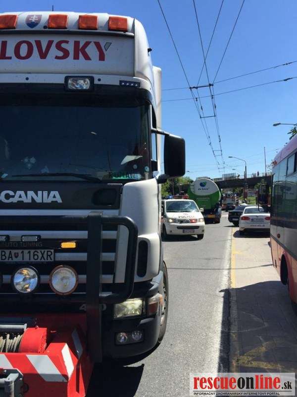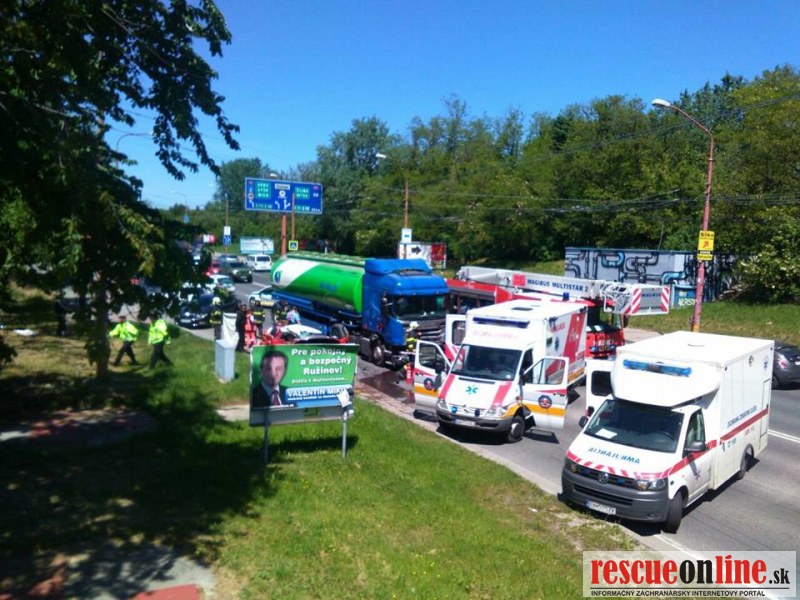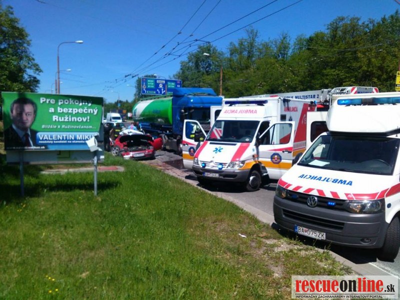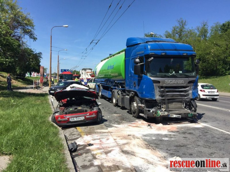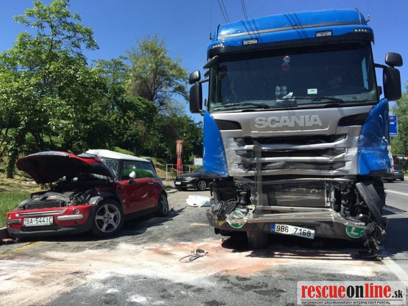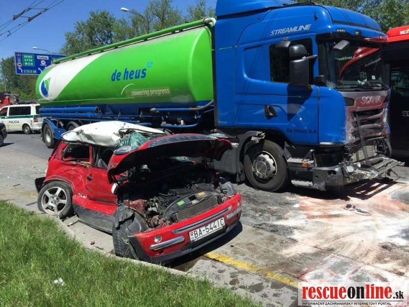 Odťahovka Jaslovský |MM| K vážnej dopravnej nehode prišlo približne o 12.20 hod. v Bratislave na Gagarinovej ul. Vodička s vozidlom Mini mala naraziť do cisterny.