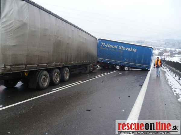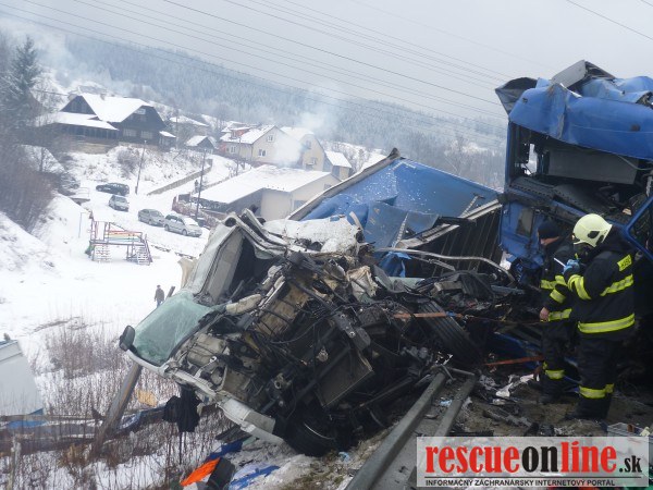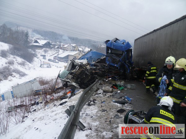 MVSR |MM| V pondelok 12. januára 2015 po deviatej hodine ráno bola ohlásená dopravná nehoda dvoch nákladných motorových vozidiel a osobného motorového vozidla na štátnej ceste I/11 v katastri obce Oščadnica, okres Čadca. V dôsledku dopravnej nehody došlo k zraneniu troch osôb. Zasahujúci príslušníci z hasičských staníc v Čadci, v Turzovke a v Kysuckom Novom Meste a príslušníci Záchrannej brigády Hasičského a záchranného zboru v Žiline vyslobodili zranené osoby z havarovaných vozidiel pomocou hydraulického vyslobodzovacieho zariadenia, poskytli im predlekársku prvú pomoc a pomohli s ich naložením do vozidiel záchrannej zdravotnej služby. Na havarovaných vozidlách vykonali protipožiarne opatrenia, pomohli s ich naložením na vozidlá odťahovej služby, unikajúce prevádzkové kvapaliny zachytili a následne očistili vozovku. Jeden z účastníkov nehody pri prevoze do nemocnice svojim zraneniam podlahol.