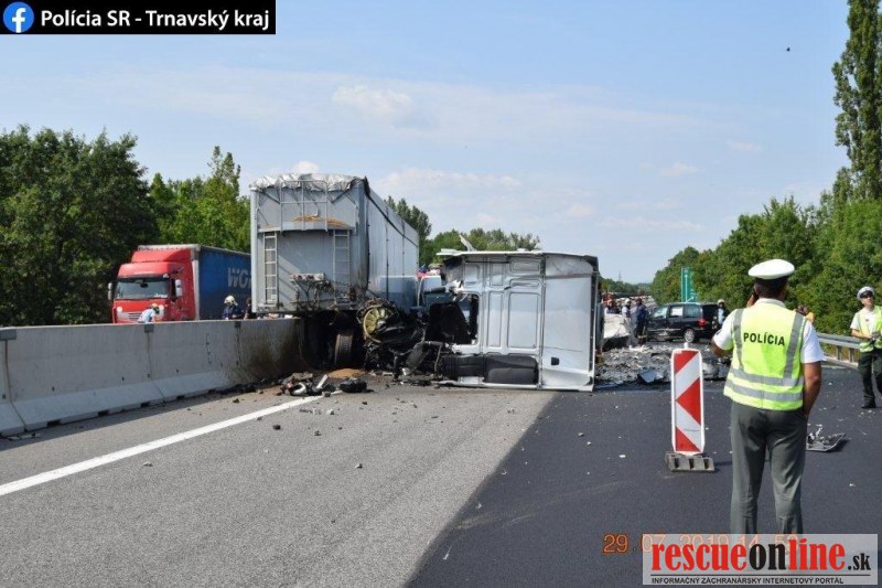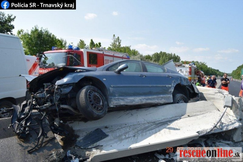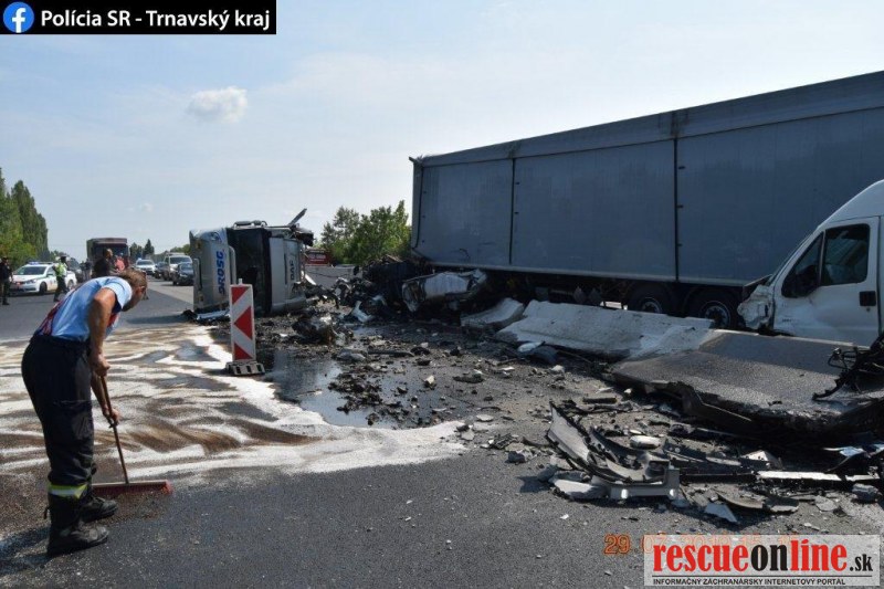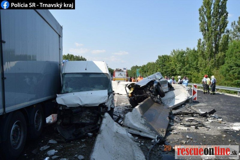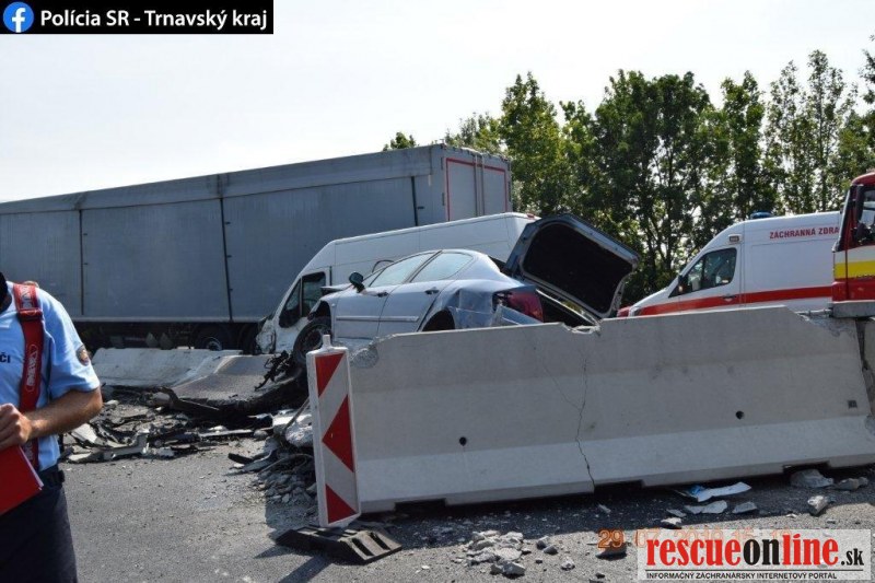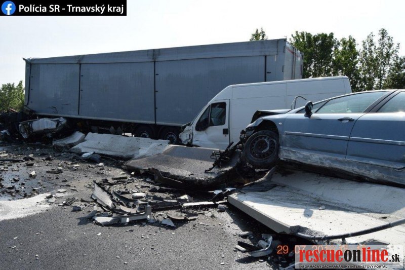 KRPZ Trnava |MM| Diaľničná polícia bola k dopravnej nehode privolaná včera, 29. 7. krátko po 14.00 h. Približne v km 64,500 asi 500 m od križovatky na Hlohovec, došlo v smere na Trnavu ku kolízii troch vozidiel. Vodič na aute Fiat Ducato, ktorý išiel za kamiónom v pravom jazdnom pruhu, pravdepodobne chcel predísť kamión a v ľavom jazdnom pruhu si asi nevšimol prichádzajúci Peugeot 406. Vodič kamiónu s rakúskym evidenčným číslom sa snažil zareagovať na vzniknutú situáciu, ale vzhľadom na plne naložený náklad ho vynieslo do stredových betónových zvodidiel, ktoré prerazil. V opačnom smere na Piešťany došlo vzápätí k zrážke s ďalšími vozidlami. Pri nehode došlo k vážnejšiemu zraneniu 16 ročnej spolujazdkyne a 43 ročnej ženy, okrem toho sa zranil aj vodič z kamiónu. Všetky zranené osoby boli prevezené do okolitých nemocníc. Pri nehode polícia alkohol u vodičov nezistila. Materiálne škody boli predbežne odhadnuté na 40 tis. eur. Okrem toho sa pri nehode poškodila aj palivová nádrž, z ktorej vytieklo niekoľko litrov nafty do okolia. Tieto škody zatiaľ vyčíslené neboli. Presné príčiny a okolnosti nehody polícia naďalej vyšetruje.