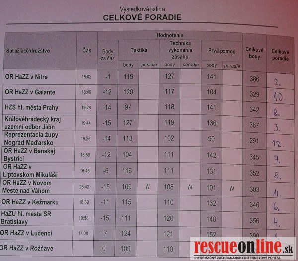 MVSR |MM| Víťazmi VI. ročníka Majstrovstiev SR vo vyslobodzovaní zranených osôb z havarovaných vozidiel sa stali hasiči z Okresného riaditeľstva HaZZ v Lučenci so ziskom 390 bodov, na 2. mieste sa umiestnilo súťažné družstvo z Okresného riaditeľstva HaZZ v Nitre so ziskom 386 bodov a na 3. mieste súťažné družstvo z Hasičského a záchranného útvaru hlavného mesta SR Bratislavy so ziskom 356 bodov.