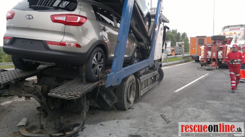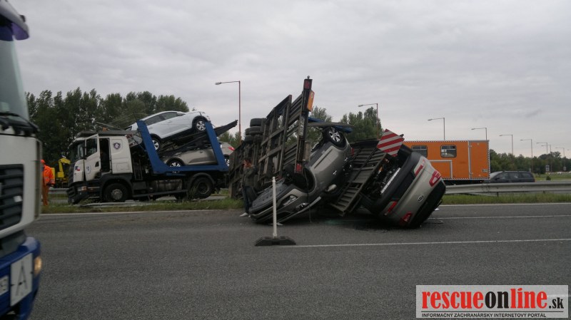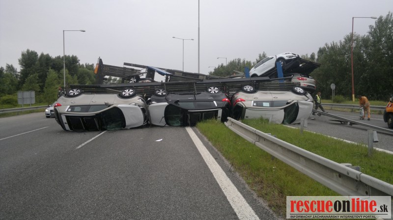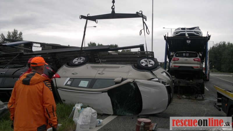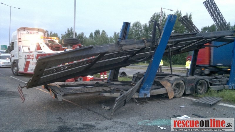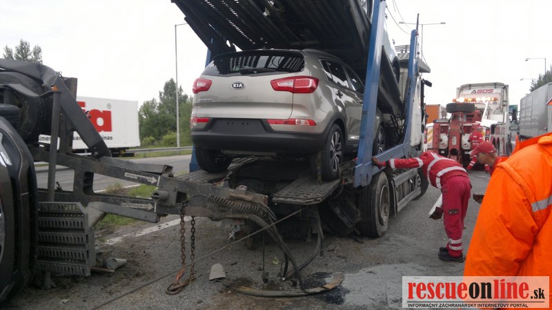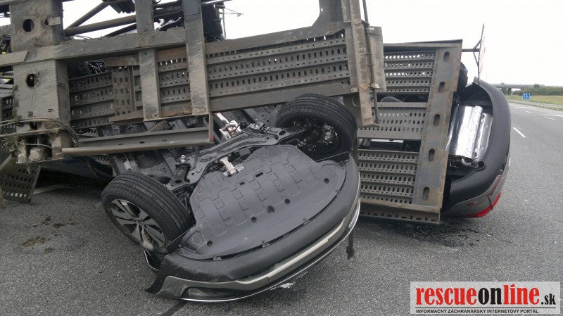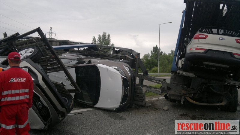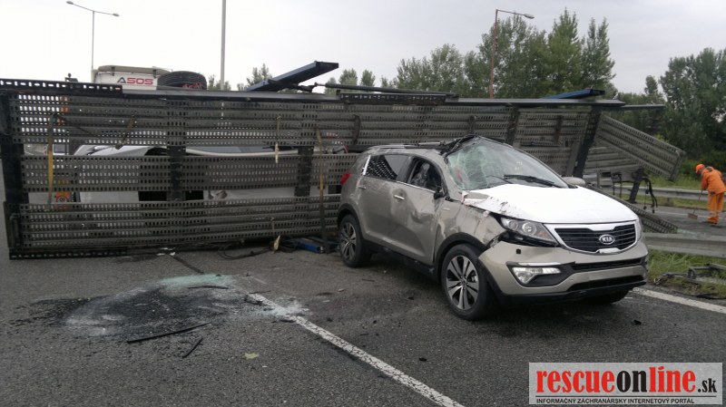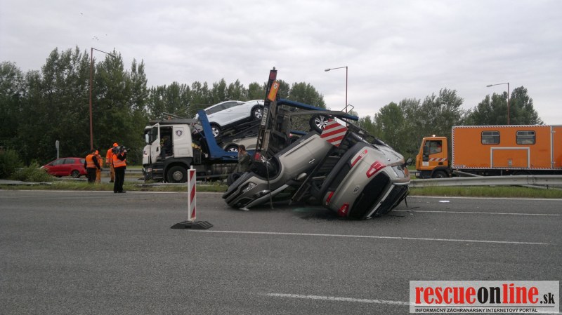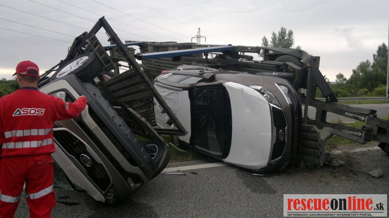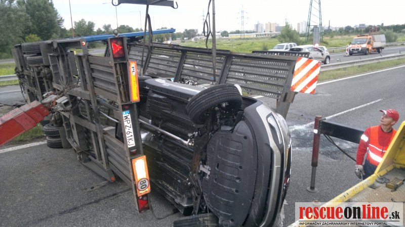 Včera 25.7.2011 krátko pred 15:00 sa stala dopravná nehoda na D2 v Bratislave za mostom Lafranconi smerom na Jarovce. Príčina nehody je v štádiu vyšetrovania. Vodič poľského kamióna kúsok za mostom Lafranconi narazil do zvodidel a lampy verejného osvetlenia na pravej strane, následne prešiel na ľavú stranu vozovky, kde sa prevrátil aj náves z prepravovanými novými vozidlami Kia Sportage. Prerazil aj zvodidlá na ľavej strane vozovky a skončil až v protismere D2. Kamión smeroval do Talianska. Všetky prepravované vozidlá boli poškodené. Veľkým šťastím bolo, že vodič kamióna bol bez zranení a a včase nehody nešiel nikto v ľavom pruhu diaľnice. Premávka v oboch smeroch bola obmedzená, lebo prevrátený kamión zasahoval do dvoch pruhov v oboch smeroch diaľnice. Smerom do Bratislavy obchádzali nehodu v odstavnom pruhu diaľnice a smerom z Bratislavy vodiči obchádzali miesto nehody v pripájacom pruhu z Bratskej ulice a tiež aj v odstavnom pruhu. Následky tejto ťažkej nehody odstraňovali pracovníci ASOS Bratislava až do neskorých večerných hodín. Následne pracovníci NDS museli vykonávať čistenie komunikácie od prevádzkových kvapalín prevrátených vozidiel ako aj odstraňovať poškodené zvodidlá z diaľnice. Plne prejazdná diaľnica bola až po 22:00.