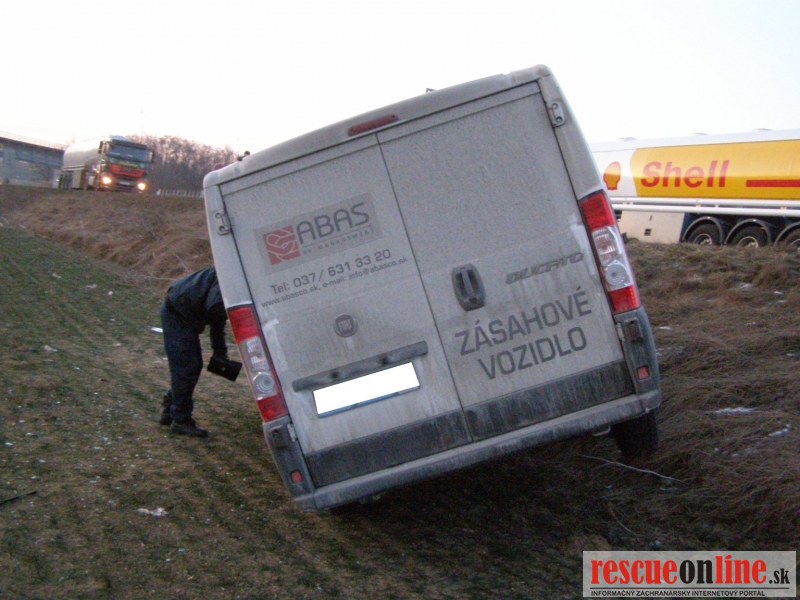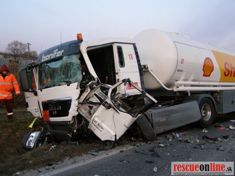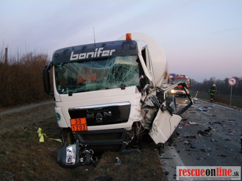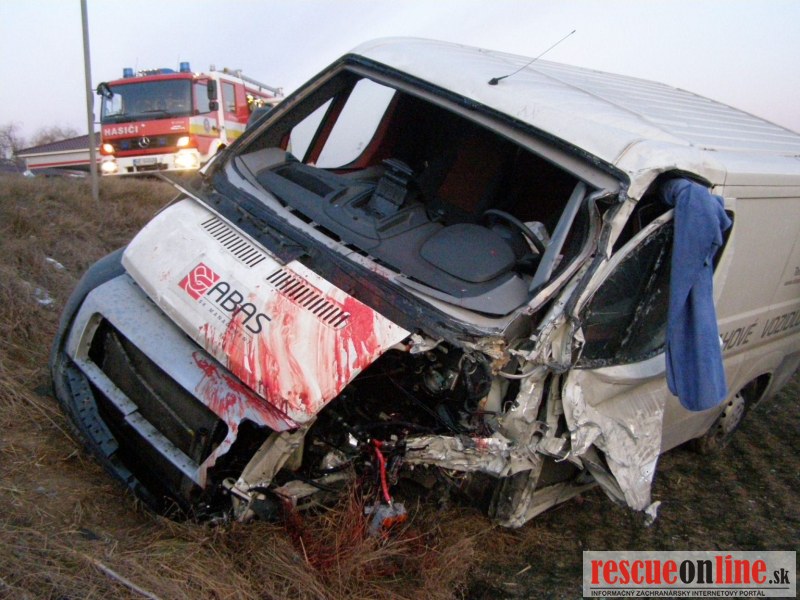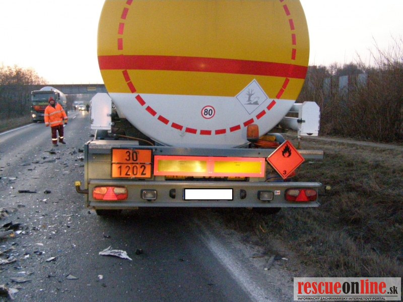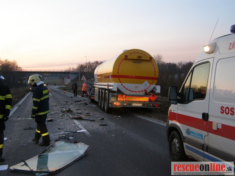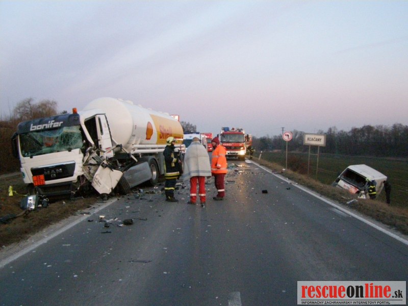 KR HaZZ Trnava |MM| Na operačné stredisko KR HaZZ v Trnave bola vo štvrtok 2. februára 2012 o 06:39 hod. prostredníctvom Operačného strediska záchrannej zdravotnej služby Trnava nahlásená dopravná nehoda jedného dodávkového (úžitkového) vozidla a jedného cisternového motorového vozidla, určeného na prevoz PHM (nafta) s dvoma zranenými účastníkmi na štátnej ceste II/513 za obcou Kľačany – hlavný cestný ťah Kľačany – Nitra, cca. 50m za čerpacou stanicou Benzinol Kľačany, okres Hlohovec. Na miesto udalosti boli vyslaní sedem príslušníkov HaZZ s hasičskou technikou AHZS MB Atego a Nissan Navara z HS Hlohovec. Po príjazde na miesto hlásenej udalosti bolo prieskumom zistené, že po dopravnej nehode sa dodávkové (úžitkové - Security) vozidlo Fiat Ducato sa nachádzalo mimo cestnej komunikácie a cisternové motorové vozidlo (ťahač s návesom) MAN na prepravu PHM (nafta), ktorý bol v čase nehody prázdny sa nachádzal na kraji vozovky. Jedna ťažko zranená osoba (spolujazdec z osobného úžitkového vozidla, ktorý pri náraze prerazil čelné sklo) a jedna ľahko zranená osoba z cisternového motorového vozidla boli v opatere Záchrannej zdravotnej služby. Príslušníci HaZZ poskytli zranenému spolujazdcovi z dodávkového vozidla zdravotné ošetrenie. Na oboch havarovaných vozidlách boli odpojené akumulátory. Havarované dodávkové vozidlo bolo príslušníkmi HaZZ vyrovnané a zabezpečené. Premávka na štátnej ceste bola v oboch smeroch uzatvorená až do príjazdu nehodovej polície. Príslušníci HaZZ odstránili úlomky havarovaných vozidiel z cestnej komunikácie a v čase 08:00 hod. bola premávka obnovená v jednom jazdnom pruhu. Po ukončení zásahu sa jednotka HaZZ o 08:38 hod. vrátila na základňu.