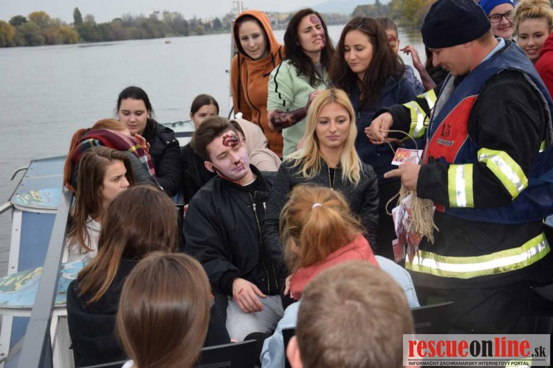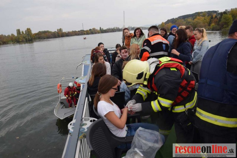 KR HaZZ Trnava |MM| Včera (17. októbra 2018) sa v Piešťanoch na vodnej nádrži Sĺňava uskutočnilo taktické cvičenie Krajského riaditeľstva Hasičského a záchranného zboru v Trnave so zriadením štábu. Námetom cvičenia bola zrážka plavidiel s následným požiarom. Cieľom cvičenia bolo preveriť pripravenosť hasičských jednotiek na vykonávanie zložitých zásahov s veľkým počtom zasahujúcich príslušníkov, preveriť súčinnosť zložiek integrovaného záchranného systému, vykonávať a zabezpečovať výkon špecifických činností zameraných na záchranu zranených osôb, likvidáciu požiaru a ochranu životného prostredia, preveriť zložky IZS pri nasadzovaní síl a prostriedkov potrebných pre vyslobodzovanie a záchranu osôb. Taktické cvičenie bolo zamerané na spôsob poskytnutia predlekárskej prvej pomoci zasahujúcich príslušníkov zraneným osobám a spôsob vyslobodzovania osôb z plavidla zasahujúcimi príslušníkmi, záchranu osôb z vodnej hladiny pomocou m-t prostriedkov potrebných na likvidáciu požiaru na plavidle a vykonanie protipožiarnych opatrení. Na cvičení sa zúčastnilo 56 hasičov z hasičských staníc Hlohovec, Piešťany, Trnava, Sereď, Galanta, Senica, Holíc, Dunajská Streda, Kúty a Šamorín, príslušníci Polície, Mestská polícia Piešťany a dve posádky ZZS. V úlohe zranených osôb sa zúčastnili študenti Strednej zdravotníckej školy v Trnave, príslušníci KR HaZZ v Trnave a členovia DHZO.