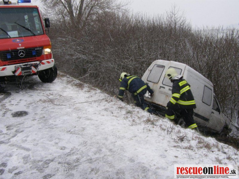 stručný popis udalosti: dopravná nehoda malého nákladného vozidla značky Citroen Jumper (prevráteného v priekope na ľavom boku) s jednou zranenou osobou (spolujazdec), bez úniku prevádzkových kvapalín